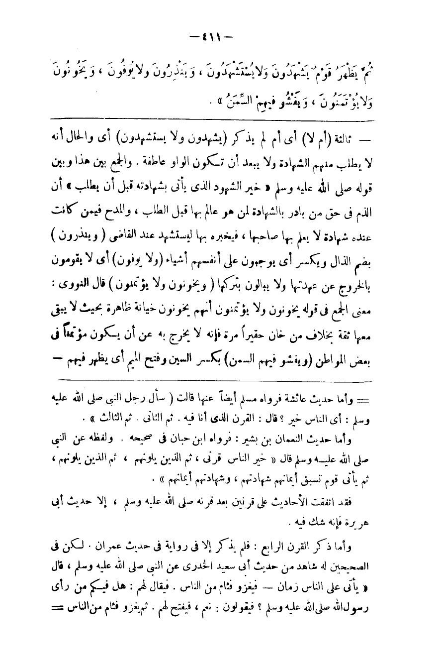 وأما ذكر القرن الرابع فلم يذكر إلا في رواية في حديث عمران لكن في الصحيحين له شاهد من حديث أبي سعيد الخدري عن النبي صلى الله عليه و سلم قال يأتي على الناس زمان فيغزو فئام من الناس