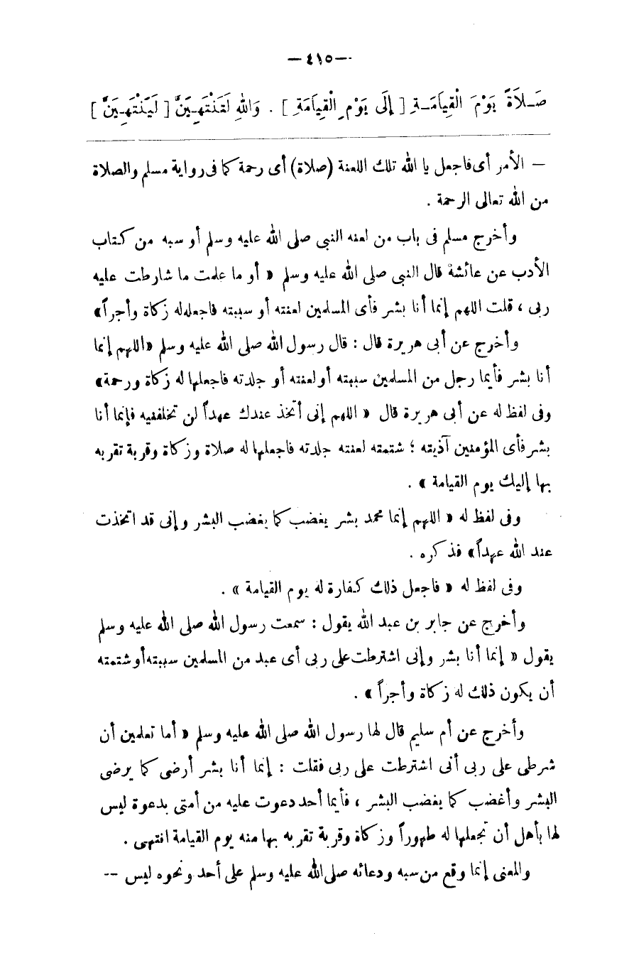 وَأَخْرَجَ مُسْلِم فِي بَاب مَنْ لَعَنَهُ النَّبِيّ صَلَّى اللَّه عَلَيْهِ وَسَلَّمَ أَوْ سَبَّهُ مِنْ كِتَاب الْأَدَب عَنْ عَائِشَة قَالَ النَّبِيّ صَلَّى اللَّه عَلَيْهِ وَسَلَّمَ " أَوَمَا عَلِمْت مَا شَارَطْت عَلَيْهِ رَبِّي ، قُلْت اللَّهُمَّ إِنَّمَا أَنَا بَشَر فَأَيّ الْمُسْلِمِينَ لَعَنْته أَوْ سَبَبْته فَاجْعَلْهُ لَهُ زَكَاة وَأَجْرًا " .