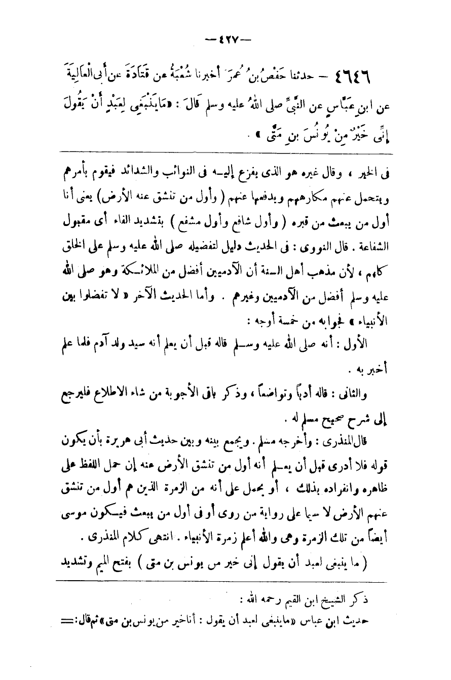 ذكر الشيخ ابن القيم رحمه الله حديث ابن عباس ما ينبغي لعبد أن يقول أنا خير من يونس بن متى ثم قال
