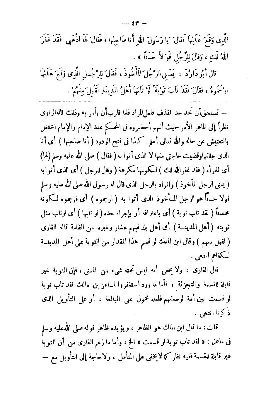 قُلْت : مَا قَالَ اِبْن الْمَلَك هُوَ الظَّاهِر ، وَيُؤَيِّدهُ ظَاهِر قَوْله صَلَّى اللَّه عَلَيْهِ وَسَلَّمَ فِي مَاعِز : " لَقَدْ تَابَ تَوْبَة لَوْ قُسِمَتْ " إِلَخْ ، وَأَمَّا مَا زَعَمَ الْقَارِي مِنْ أَنَّ التَّوْبَة غَيْر قَابِلَة لِلْقِسْمَةِ فَفِيهِ نَظَر كَمَا لَا يَخْفَى عَلَى الْمُتَأَمِّل ، وَلَا حَاجَة إِلَى التَّأْوِيل مَعَ @