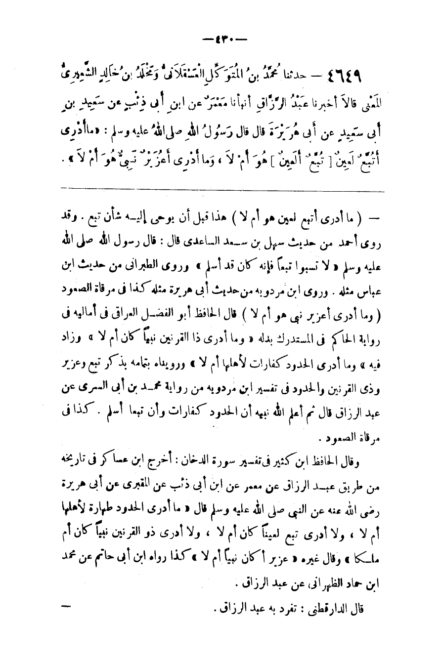 وَقَالَ الْحَافِظ اِبْن كَثِير فِي تَفْسِير سُورَة الدُّخَان : أَخْرَجَ اِبْن عَسَاكِر فِي تَارِيخه مِنْ طَرِيق عَبْد الرَّزَّاق عَنْ مَعْمَر عَنْ اِبْن أَبِي ذِئْب عَنْ الْمَقْبُرِيِّ عَنْ أَبِي هُرَيْرَة رَضِيَ اللَّه عَنْهُ عَنْهُ عَنْ النَّبِيّ صَلَّى اللَّه عَلَيْهِ وَسَلَّمَ قَالَ " مَا أَدْرِي الْحُدُود طَهَارَة لِأَهْلِهَا أَوْ لَا ، وَلَا أَدْرِي تُبَّع لَعِينًا كَانَ أَمْ لَا ، وَلَا أَدْرِي ذُو الْقَرْنَيْنِ نَبِيًّا كَانَ أَمْ مَلِكًا " وَقَالَ غَيْره " عُزَيْرًا كَانَ نَبِيًّا أَمْ لَا " كَذَا رَوَاهُ اِبْن أَبِي حَاتِم عَنْ مُحَمَّد بْن حَمَّاد الظَّهْرَانِيّ عَنْ عَبْد الرَّزَّاق .