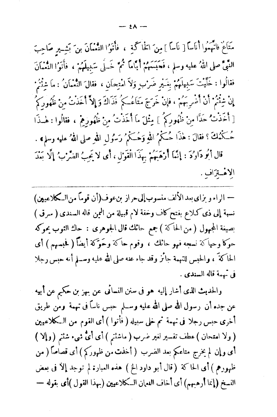 وَالْحَدِيث الَّذِي أَشَارَ إِلَيْهِ هُوَ فِي سُنَن النَّسَائِيِّ عَنْ بَهْز بْن حَكِيم عَنْ أَبِيهِ عَنْ جَدّه أَنَّ رَسُول اللَّه حَبَسَ نَاسًا فِي تُهْمَة وَمِنْ طَرِيق أُخْرَى حَبَسَ رَجُلًا فِي تُهْمَة ثُمَّ خَلَّى سَبِيله