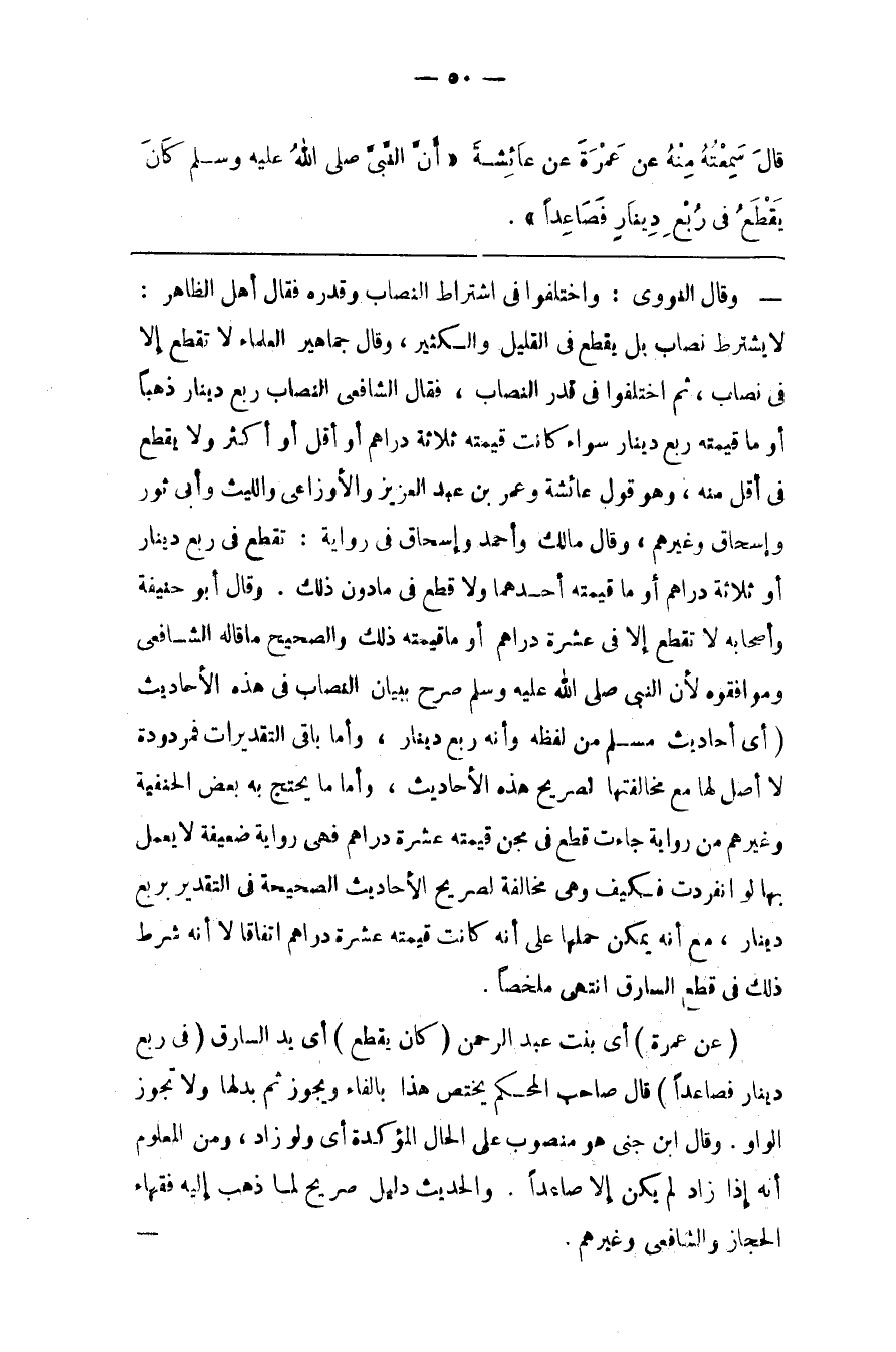 وَقَالَ النَّوَوِيّ : وَاخْتَلَفُوا فِي اِشْتِرَاط النِّصَاب وَقَدْره فَقَالَ أَهْل الظَّاهِر : لَا يُشْتَرَط نِصَاب بَلْ يُقْطَع فِي الْقَلِيل وَالْكَثِير ، وَقَالَ جَمَاهِير الْعُلَمَاء لَا تُقْطَع إِلَّا فِي نِصَاب ، ثُمَّ اِخْتَلَفُوا فِي قَدْر النِّصَاب ، فَقَالَ الشَّافِعِيّ النِّصَاب رُبْع دِينَار ذَهَبًا أَوْ مَا قِيمَته رُبْع دِينَار سَوَاء كَانَتْ قِيمَته ثَلَاثَة دَرَاهِم أَوْ أَقَلّ أَوْ أَكْثَر وَلَا يُقْطَع فِي أَقَلّ مِنْهُ ، وَهُوَ قَوْل عَائِشَة وَعُمَر بْن عَبْد الْعَزِيز وَالْأَوْزَاعِيِّ وَاللَّيْث وَأَبِي ثَوْر وَإِسْحَاق وَغَيْرهمْ ، وَقَالَ مَالِك وَأَحْمَد وَإِسْحَاق فِي رِوَايَة : تُقْطَع فِي رُبْع دِينَار أَوْ ثَلَاثَة دَرَاهِم أَوْ مَا قِيمَته أَحَدهمَا وَلَا قَطْع فِي مَا دُون ذَلِكَ . وَقَالَ أَبُو حَنِيفَة وَأَصْحَابه لَا تُقْطَع إِلَّا فِي عَشَرَة دَرَاهِم أَوْ مَا قِيمَته ذَلِكَ وَالصَّحِيح مَا قَالَهُ الشَّافِعِيّ وَمُوَافِقُوهُ لِأَنَّ النَّبِيّ صَلَّى اللَّه عَلَيْهِ وَسَلَّمَ صَرَّحَ بِبَيَانِ النِّصَاب فِي هَذِهِ الْأَحَادِيث أَيْ أَحَادِيث مُسْلِم مِنْ لَفْظه وَأَنَّهُ رُبْع دِينَار ، وَأَمَّا بَاقِي التَّقْدِيرَات فَمَرْدُودَة لَا أَصْل لَهَا مَعَ مُخَالَفَتهَا لِصَرِيحِ هَذِهِ الْأَحَادِيث ، وَأَمَّا مَا يَحْتَجّ بِهِ بَعْض الْحَنَفِيَّة وَغَيْرهمْ مِنْ رِوَايَة جَاءَتْ قَطَعَ فِي مِجَنّ قِيمَته عَشَرَة دَرَاهِم فَهِيَ رِوَايَة ضَعِيفَة لَا يُعْمَل بِهَا لَوْ اِنْفَرَدَتْ فَكَيْف وَهِيَ مُخَالِفَة لِصَرِيحِ الْأَحَادِيث الصَّحِيحَة فِي التَّقْدِير بِرُبْعِ دِينَار ، مَعَ أَنَّهُ يُمْكِن حَمْلهَا عَلَى أَنَّهُ كَانَتْ قِيمَته عَشَرَة دَرَاهِم اِتِّفَاقًا لَا أَنَّهُ شُرِطَ ذَلِكَ فِي قَطْع السَّارِق اِنْتَهَى مُلَخَّصًا .