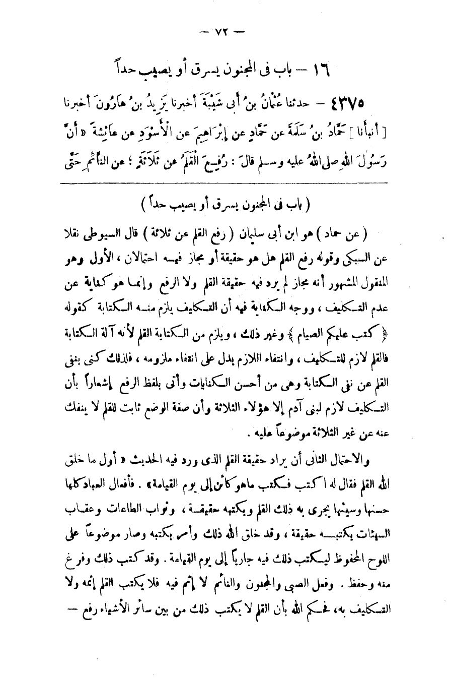 : قَالَ السُّيُوطِيُّ نَقْلًا عَنْ السُّبْكِيّ وَقَوْله رُفِعَ الْقَلَم هَلْ هُوَ حَقِيقَة أَوْ مَجَاز فِيهِ اِحْتِمَالَانِ ، الْأَوَّل وَهُوَ الْمَنْقُول الْمَشْهُور أَنَّهُ مَجَاز لَمْ يُرِدْ فِيهِ حَقِيقَة الْقَلَم وَلَا الرَّفْع وَإِنَّمَا هُوَ كِنَايَة عَنْ عَدَم التَّكْلِيف ، وَوَجْه الْكِنَايَة فِيهِ أَنَّ التَّكْلِيف يَلْزَم مِنْهُ الْكِتَابَة كَقَوْلِهِ { كُتِبَ عَلَيْكُمْ الصِّيَام } وَغَيْر ذَلِكَ ، وَيَلْزَم مِنْ الْكِتَابَة الْقَلَم لِأَنَّهُ آلَة الْكِتَابَة فَالْقَلَم لَازِم لِلتَّكْلِيفِ ، وَانْتِفَاء اللَّازِم يَدُلّ عَلَى اِنْتِفَاء مَلْزُومه ، فَلِذَلِكَ كَنَّى بِنَفْيِ الْقَلَم عَنْ نَفْي الْكِتَابَة وَهِيَ مِنْ أَحْسَن الْكِنَايَات وَأَتَى بِلَفْظِ الرَّفْع إِشْعَارًا بِأَنَّ التَّكْلِيف لَازِم لِبَنِي آدَم إِلَّا هَؤُلَاءِ الثَّلَاثَة وَأَنَّ صِفَة الْوَضْع ثَابِت لِلْقَلَمِ لَا يَنْفَكّ عَنْهُ عَنْ غَيْر الثَّلَاثَة مَوْضُوعًا عَلَيْهِ .