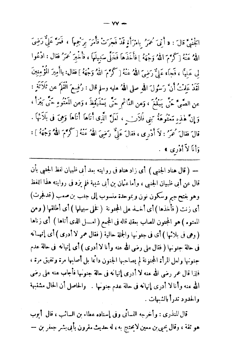 : أَيْ إِتْيَانه فِي حَالَة عَدَم جُنُونهَا وَلَعَلَّ الْمَرْأَة الْمَجْنُونَة لَمْ يُصَاحِبهَا الْجُنُون دَائِمًا بَلْ أَصَابَهَا مَرَّة وَتُفِيق مَرَّة ، فَلِذَا قَالَ عُمَر رَضِيَ اللَّه عَنْهُ لَا أَدْرِي إِتْيَانه فِي حَالَة جُنُونهَا فَأَجَابَ عَنْهُ عَلِيّ رَضِيَ اللَّه عَنْهُ وَأَنَا لَا أَدْرِي إِتْيَانه فِي حَالَة عَدَم جُنُونهَا . وَالْحَاصِل أَنَّ الْحَال مُشْتَبِهَة وَالْحُدُود تُدْرَأ بِالشُّبُهَاتِ .