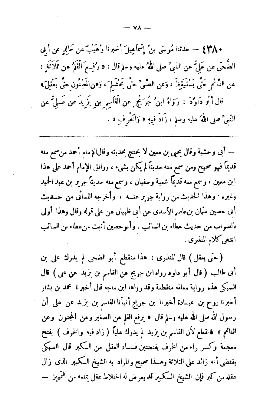 : قَالَ السُّبْكِيّ هَذِهِ رِوَايَة مُعَلَّقَة مُنْقَطِعَة وَقَدْ رَوَاهَا اِبْن مَاجَهْ قَالَ أَخْبَرَنَا مُحَمَّد بْن بَشَّار أَخْبَرَنَا رَوْح بْن عُبَادَةَ أَخْبَرَنَا اِبْن جُرَيْجٍ أَنْبَأَنَا الْقَاسِم بْن يَزِيد عَنْ عَلِيّ أَنَّ رَسُول اللَّه صَلَّى اللَّه عَلَيْهِ وَسَلَّمَ قَالَ : " يُرْفَع الْقَلَم عَنْ الصَّغِير وَعَنْ الْمَجْنُون وَعَنْ النَّائِم " فَانْقَطَعَ لِأَنَّ الْقَاسِم بْن يَزِيد لَمْ يُدْرِك عَلِيًّا