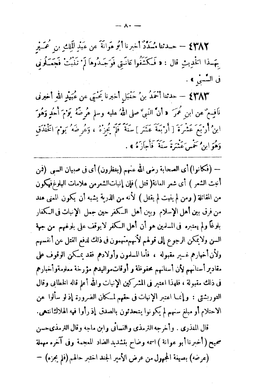 لِأَنَّهُ مِنْ الذُّرِّيَّة يُشْبِه أَنْ يَكُون الْمَعْنَى عِنْد مَنْ فَرَّقَ بَيْن أَهْل الْإِسْلَام وَبَيْن أَهْل الْكُفْر حِين جَعَلَ الْإِنْبَات فِي الْكُفَّار بُلُوغًا وَلَمْ يَعْتَبِرهُ فِي الْمُسْلِمِينَ هُوَ أَنَّ أَهْل الْكُفْر لَا يُوقَف عَلَى بُلُوغهمْ مِنْ جِهَة السِّنّ وَلَا يُمْكِن الرُّجُوع إِلَى قَوْلهمْ لِأَنَّهُمْ مُتَّهَمُونَ فِي ذَلِكَ لِدَفْعِ الْقَتْل عَنْ أَنْفُسهمْ وَلِأَنَّ أَخْبَارهمْ غَيْر مَقْبُولَة ، فَأَمَّا الْمُسْلِمُونَ وَأَوْلَادهمْ فَقَدْ يُمْكِن الْوُقُوف عَلَى مَقَادِير أَسْنَانهمْ لِأَنَّ أَسْنَانهمْ مَحْفُوظَة وَأَوْقَات مَوَالِيدهمْ مُؤَرَّخَة مَعْلُومَة وَأَخْبَارهمْ فِي ذَلِكَ مَقْبُولَة ، فَلِهَذَا اُعْتُبِرَ فِي الْمُشْرِكِينَ الْإِنْبَات وَاَللَّه أَعْلَم قَالَهُ الْخَطَّابِيُّ وَقَالَ التُّورْبَشْتِيُّ : وَإِنَّمَا اُعْتُبِرَ الْإِنْبَات فِي حَقّهمْ لِمَكَانِ الضَّرُورَة إِذْ لَوْ سُئِلُوا عَنْ الِاحْتِلَام أَوْ مَبْلَغ سِنّهمْ لَمْ يَكُونُوا يَتَحَدَّثُونَ بِالصِّدْقِ إِذْ رَأَوْا فِيهِ الْهَلَاك اِنْتَهَى .