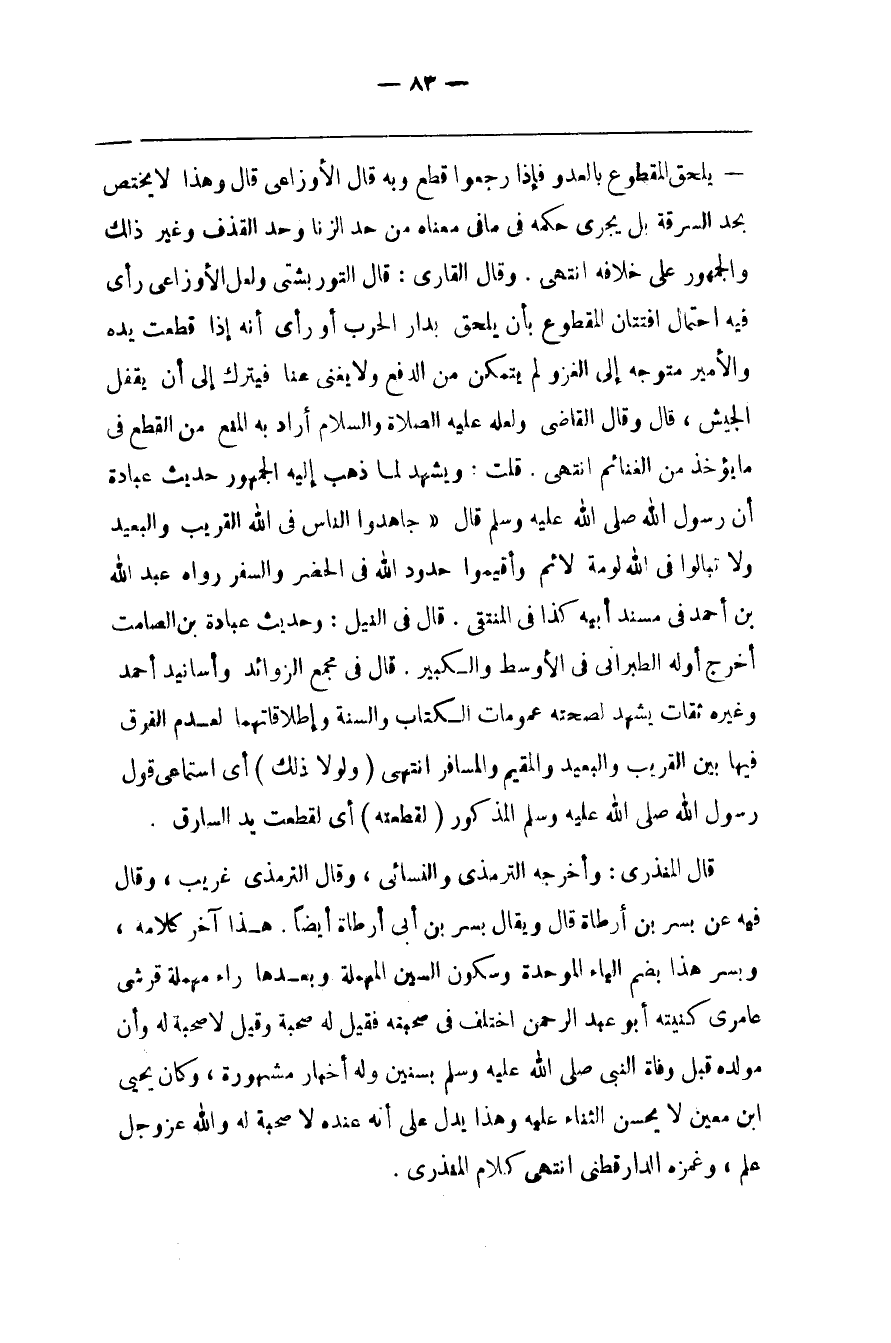 يَلْحَق الْمَقْطُوع بِالْعَدُوِّ فَإِذَا رَجَعُوا قُطِعَ وَبِهِ قَالَ الْأَوْزَاعِيُّ قَالَ وَهَذَا لَا يَخْتَصّ بِحَدِّ السَّرِقَة بَلْ يَجْرِي حُكْمه فِي مَا فِي مَعْنَاهُ مِنْ حَدّ الزِّنَا وَحْد الْقَذْف وَغَيْر ذَلِكَ وَالْجُمْهُور عَلَى خِلَافه اِنْتَهَى . وَقَالَ الْقَارِي : قَالَ التُّورْبَشْتِيُّ وَلَعَلَّ الْأَوْزَاعِيَّ رَأَى فِيهِ اِحْتِمَال اِفْتِتَان الْمَقْطُوع بِأَنْ يَلْحَق بِدَارِ الْحَرْب أَوْ رَأَى أَنَّهُ إِذَا قُطِعَتْ يَده وَالْأَمِير مُتَوَجِّه إِلَى الْغَزْو لَمْ يَتَمَكَّن مِنْ الدَّفْع وَلَا يُغْنِي عَنَّا فَيُتْرَك إِلَى أَنْ يَقْفِل الْجَيْش ، قَالَ وَقَالَ الْقَاضِي وَلَعَلَّهُ عَلَيْهِ الصَّلَاة وَالسَّلَام أَرَادَ بِهِ الْمَنْع مِنْ الْقَطْع فِي مَا يُؤْخَذ مِنْ الْغَنَائِم اِنْتَهَى . قُلْت : وَيَشْهَد لِمَا ذَهَبَ إِلَيْهِ الْجُمْهُور حَدِيث عُبَادَةَ أَنَّ رَسُول اللَّه صَلَّى اللَّه عَلَيْهِ وَسَلَّمَ قَالَ : " جَاهِدُوا النَّاس فِي اللَّه الْقَرِيب وَالْبَعِيد وَلَا تُبَالُوا فِي اللَّه لَوْمَة لَائِم وَأَقِيمُوا حُدُود اللَّه فِي الْحَضَر وَالسَّفَر " ، رَوَاهُ عَبْد اللَّه بْن أَحْمَد فِي مُسْنَد أَبِيهِ كَذَا فِي الْمُنْتَقَى . قَالَ فِي النَّيْل : وَحَدِيث عُبَادَةَ بْن الصَّامِت أَخْرَجَ أَوَّله الطَّبَرَانِيُّ فِي الْأَوْسَط وَالْكَبِير . قَالَ فِي مَجْمَع الزَّوَائِد وَأَسَانِيد أَحْمَد وَغَيْره ثِقَات يَشْهَد لِصِحَّتِهِ عُمُومَات الْكِتَاب وَالسُّنَّة وَإِطْلَاقَاتهمَا لِعَدَمِ الْفَرْق فِيهَا بَيْن الْقَرِيب وَالْبَعِيد وَالْمُقِيم وَالْمُسَافِر اِنْتَهَى