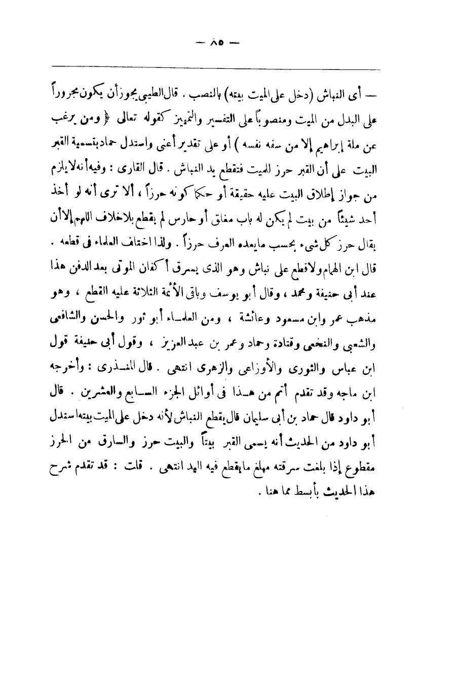 بِالنَّصْبِ . قَالَ الطِّيبِيّ يَجُوز أَنْ يَكُون مَجْرُورًا عَلَى الْبَدَل مِنْ الْمَيِّت وَمَنْصُوبًا عَلَى التَّفْسِير وَالتَّمْيِيز كَقَوْلِهِ تَعَالَى : { وَمَنْ يَرْغَب عَنْ مِلَّة إِبْرَاهِيم إِلَّا مَنْ سَفِهَ نَفْسه } : أَوْ عَلَى تَقْدِير أَعْنِي وَاسْتَدَلَّ حَمَّاد بِتَسْمِيَةِ الْقَبْر الْبَيْت عَلَى أَنَّ الْقَبْر حِرْز لِلْمَيِّتِ فَتُقْطَع يَد النَّبَّاش . قَالَ الْقَارِي : وَفِيهِ أَنَّهُ لَا يَلْزَم مِنْ جَوَاز إِطْلَاق الْبَيْت عَلَيْهِ حَقِيقَة أَوْ حُكْمًا كَوْنه حِرْزًا ، أَلَا تَرَى أَنَّهُ لَوْ أَخَذَ أَحَد شَيْئًا مِنْ بَيْت لَمْ يَكُنْ لَهُ بَاب مُغْلَق أَوْ حَارِس لَمْ يُقْطَع بِلَا خِلَاف اللَّهُمَّ إِلَّا أَنْ يُقَال حِرْز كُلّ شَيْء بِحَسَبِ مَا يَعُدّهُ الْعُرْف حِرْزًا . وَلِذَا اِخْتَلَفَ الْعُلَمَاء فِي قَطْعه . قَالَ اِبْن الْهُمَام وَلَا قَطْع عَلَى نَبَّاش وَهُوَ الَّذِي يَسْرِق أَكْفَان الْمَوْتَى بَعْد الدَّفْن هَذَا عِنْد أَبِي حَنِيفَة وَمُحَمَّد ، وَقَالَ أَبُو يُوسُف وَبَاقِي الْأَئِمَّة الثَّلَاثَة عَلَيْهِ الْقَطْع ، وَهُوَ مَذْهَب عُمَر وَابْن مَسْعُود وَعَائِشَة ، وَمِنْ الْعُلَمَاء أَبُو ثَوْر وَالْحَسَن وَالشَّافِعِيّ ، وَالشَّعْبِيّ وَالنَّخَعِيّ وَقَتَادَة وَحَمَّاد وَعُمَر بْن عَبْد الْعَزِيز ، وَقَوْل أَبِي حَنِيفَة قَوْل اِبْن عَبَّاس وَالثَّوْرِيِّ وَالْأَوْزَاعِيِّ وَالزُّهْرِيّ اِنْتَهَى .