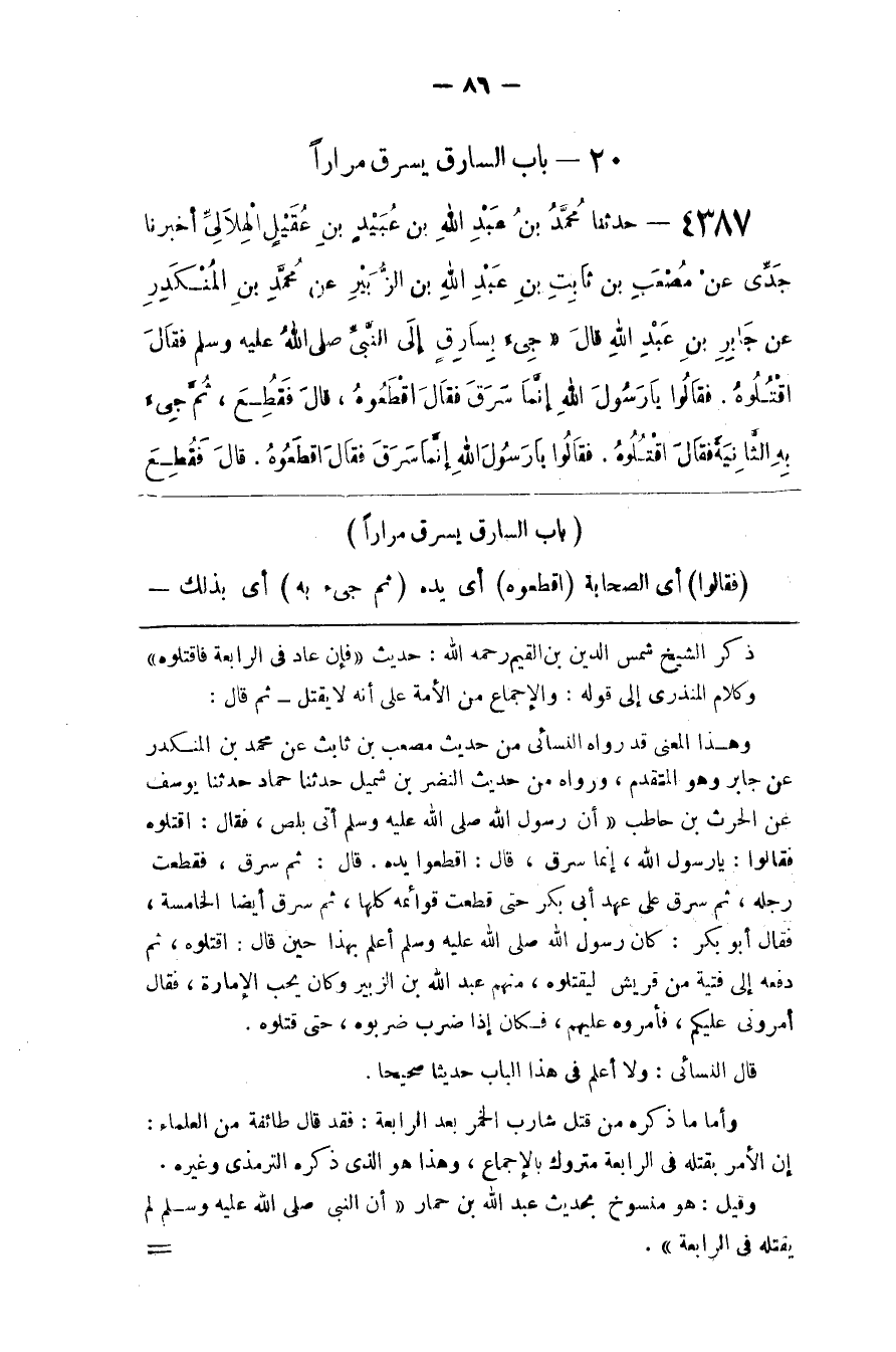 ذكر الشيخ شمس الدين بن القيم رحمه الله حديث فإن عاد في الرابعة فاقتلوه وكلام المنذري إلى قوله والإجماع من الأمة على أنه لا يقتل ثم قال وهذا المعنى قد رواه النسائي من حديث مصعب بن ثابت عن محمد بن المنكدر عن جابر وهو المتقدم ورواه من حديث النضر بن شميل حدثنا حماد حدثنا يوسف عن الحرث بن حاطب أن رسول الله صلى الله عليه و سلم أتى بلص فقال اقتلوه فقالوا يا رسول الله إنما سرق قال اقطعوا يده