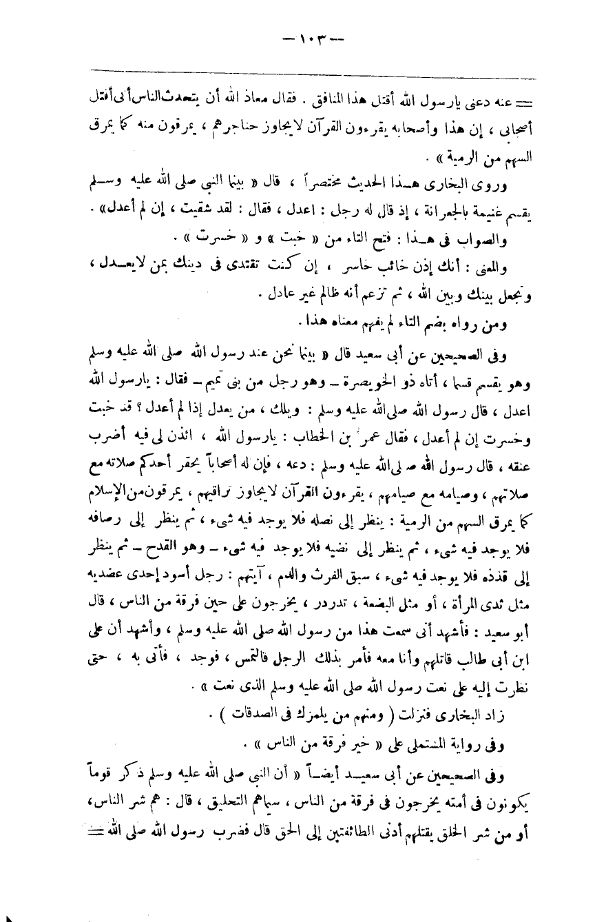 فقال معاذ الله أن يتحدث الناس أني أقتل أصحابي إن هذا وأصحابه يقرأون القرآن لا يجاوز حناجرهم يمرقون منه كما يمرق السهم من الرمية