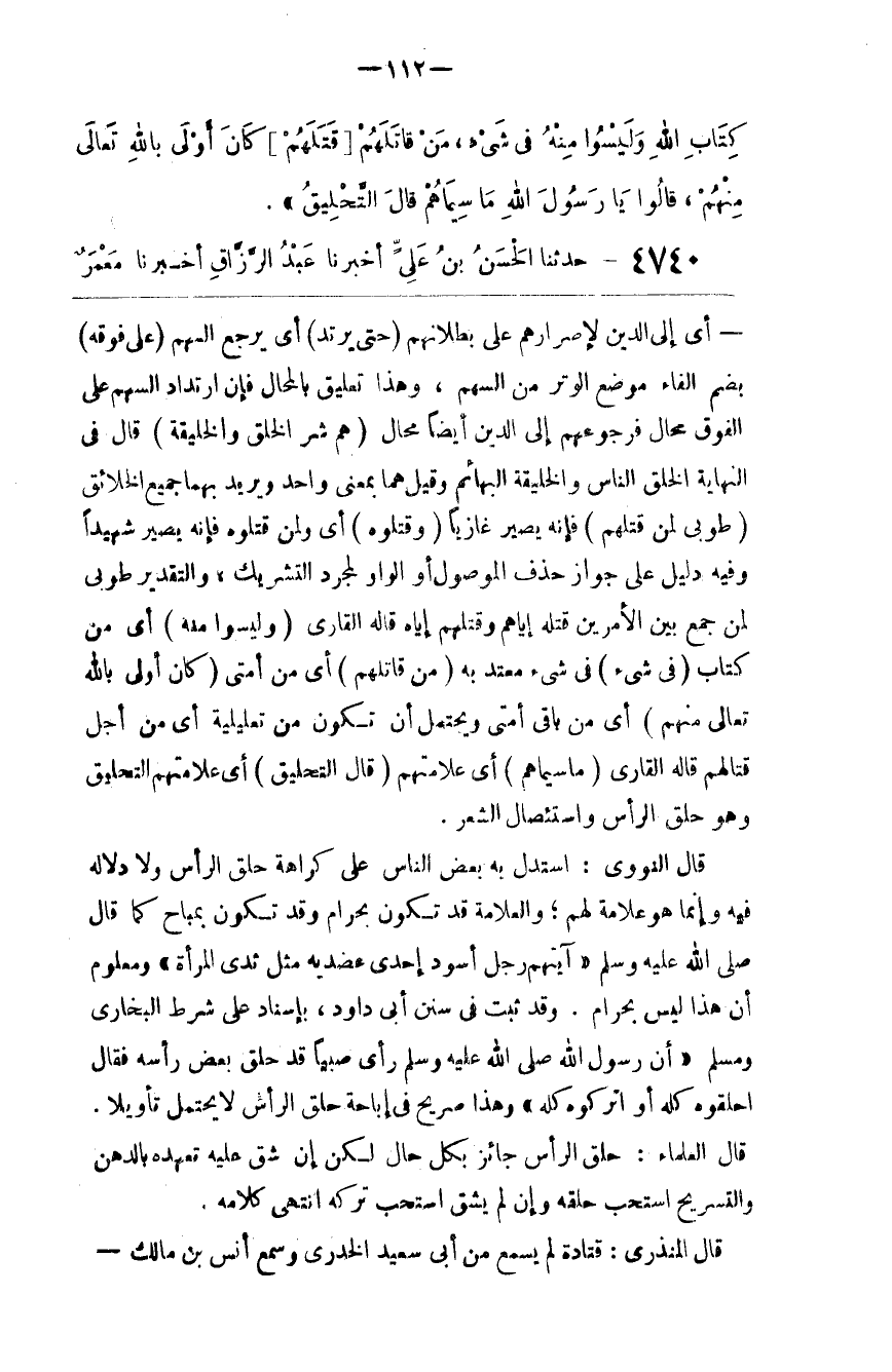 قَالَ النَّوَوِيّ : اِسْتَدَلَّ بِهِ بَعْض النَّاس عَلَى كَرَاهَة حَلْق الرَّأْس وَلَا دَلَالَة فِيهِ وَإِنَّمَا هُوَ عَلَامَة لَهُمْ ؛ وَالْعَلَامَة قَدْ تَكُون بِحَرَامٍ وَقَدْ تَكُون بِمُبَاحٍ كَمَا قَالَ صَلَّى اللَّه عَلَيْهِ وَسَلَّمَ " آيَتهمْ رَجُل أَسْوَد إِحْدَى عَضُدَيْهِ مِثْل ثَدْي الْمَرْأَة " وَمَعْلُوم أَنَّ هَذَا لَيْسَ بِحَرَامٍ . وَقَدْ ثَبَتَ فِي سُنَن أَبِي دَاوُدَ ، بِإِسْنَادٍ عَلَى شَرْط الْبُخَارِيّ وَمُسْلِم " أَنَّ رَسُول اللَّه صَلَّى اللَّه عَلَيْهِ وَسَلَّمَ رَأَى صَبِيًّا قَدْ حَلَقَ بَعْض رَأْسه فَقَالَ اِحْلِقُوهُ كُلّه أَوْ اُتْرُكُوهُ كُلّه " وَهَذَا صَرِيح فِي إِبَاحَة حَلْق الرَّأْس لَا يَحْتَمِل تَأْوِيلًا . قَالَ الْعُلَمَاء : حَلْق الرَّأْس جَائِز بِكُلِّ حَال لَكِنْ إِنْ شَقَّ عَلَيْهِ تَعَهُّده بِالدُّهْنِ وَالتَّسْرِيح اُسْتُحِبَّ حَلْقه وَإِنْ لَمْ يَشُقّ اُسْتُحِبَّ تَرْكه اِنْتَهَى كَلَامه .