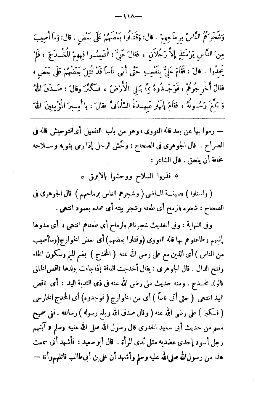 رِسَالَته. فَفِي صَحِيح مُسْلِم مِنْ حَدِيث أَبِي سَعِيد الْخُدْرِيِّ قَالَ رَسُول اللَّه صَلَّى اللَّه عَلَيْهِ وَسَلَّمَ " آيَتهمْ رَجُل أَسْوَد إِحْدَى عَضُدَيْهِ مِثْل ثَدْي الْمَرْأَة . قَالَ أَبُو سَعِيد : فَاشْهَدْ أَنِّي سَمِعْت هَذَا مِنْ رَسُول اللَّه صَلَّى اللَّه عَلَيْهِ وَسَلَّمَ وَأَشْهَد أَنَّ عَلِيّ بْن أَبِي طَالِب قَاتَلَهُمْ وَأَنَا @
