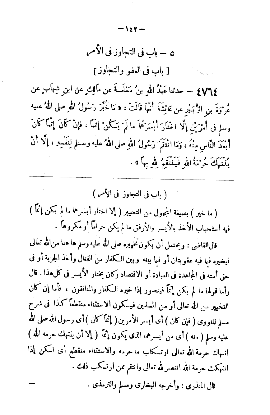 قَالَ الْقَاضِي : وَيَحْتَمِل أَنْ يَكُون تَخْيِيره صَلَّى اللَّه عَلَيْهِ وَسَلَّمَ هَاهُنَا مِنْ اللَّه تَعَالَى فَيُخَيِّرهُ فِيمَا فِيهِ عُقُوبَتَانِ أَوْ فِيمَا بَيْنه وَبَيْن الْكُفَّار مِنْ الْقِتَال وَأَخْذ الْجِزْيَة أَوْ فِي حَقّ أُمَّته فِي الْمُجَاهَدَة فِي الْعِبَادَة أَوْ الِاقْتِصَاد وَكَانَ يَخْتَار الْأَيْسَر فِي كُلّ هَذَا . قَالَ وَأَمَّا قَوْلهَا مَا لَمْ يَكُنْ إِثْمًا فَيَتَصَوَّر إِذَا خَيَّرَهُ الْكُفَّار وَالْمُنَافِقُونَ ، فَأَمَّا إِنْ كَانَ التَّخْيِير مِنْ اللَّه تَعَالَى أَوْ مِنْ الْمُسْلِمِينَ فَيَكُون الِاسْتِثْنَاء مُنْقَطِعًا كَذَا فِي شَرْح مُسْلِم لِلنَّوَوِيِّ