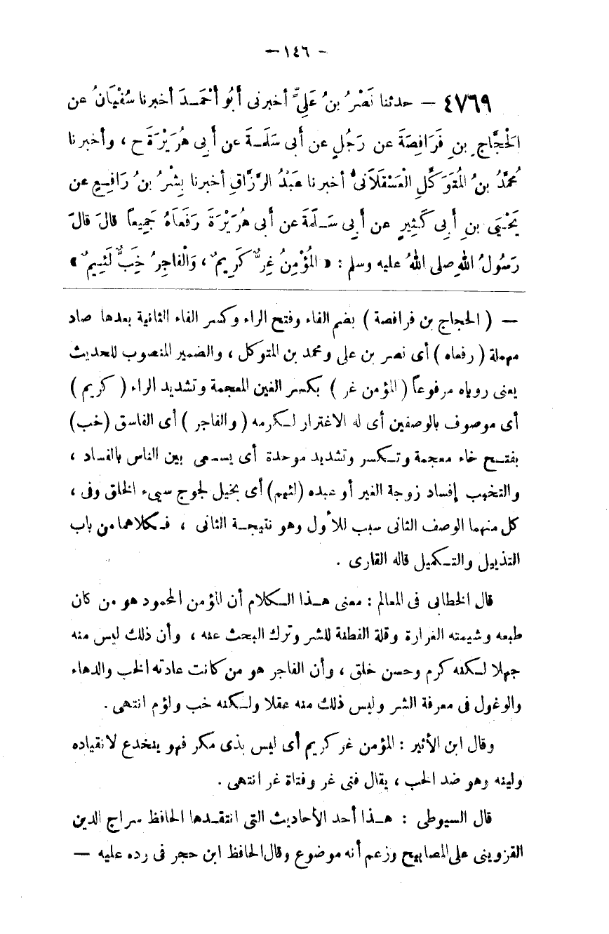 قَالَ الْخَطَّابِيُّ فِي الْمَعَالِم : مَعْنَى هَذَا الْكَلَام أَنَّ الْمُؤْمِن الْمَحْمُود هُوَ مَنْ كَانَ طَبْعه وَشِيمَته الْغِرَارَة وَقِلَّة الْفِطْنَة لِلشَّرِّ وَتَرْك الْبَحْث عَنْهُ ، وَأَنَّ ذَلِكَ لَيْسَ مِنْهُ جَهْلًا لَكِنَّهُ كَرَم وَحُسْن خُلُق ، وَأَنَّ الْفَاجِر هُوَ مَنْ كَانَتْ عَادَته الْخَبّ وَالدَّهَاء وَالْوُغُول فِي مَعْرِفَة الشَّرّ وَلَيْسَ ذَلِكَ مِنْهُ عَقْلًا وَلَكِنَّهُ خِبّ وَلَؤُوم اِنْتَهَى .