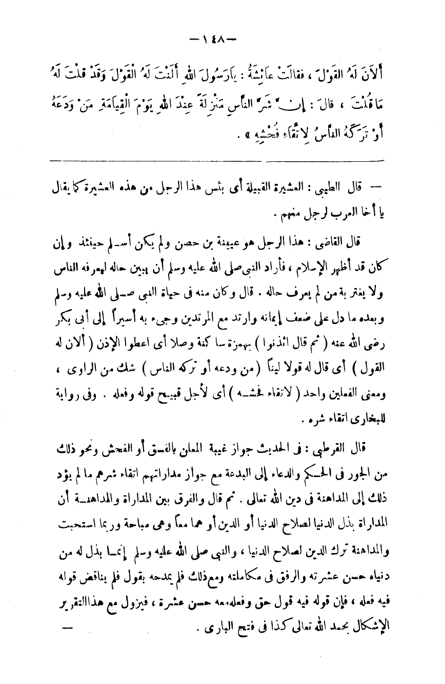 قَالَ الْقُرْطُبِيّ : فِي الْحَدِيث جَوَاز غَيْبَة الْمُعْلَن بِالْفِسْقِ أَوْ الْفُحْش وَنَحْو ذَلِكَ مِنْ الْجَوْر فِي الْحُكْم وَالدُّعَاء إِلَى الْبِدْعَة مَعَ جَوَاز مُدَارَاتهمْ اِتِّقَاء شَرّهمْ مَا لَمْ يُؤَدِّ ذَلِكَ إِلَى الْمُدَاهَنَة فِي دِين اللَّه تَعَالَى . ثُمَّ قَالَ وَالْفَرْق بَيْن الْمُدَارَاة وَالْمُدَاهَنَة أَنَّ الْمُدَارَاة بَذْل الدُّنْيَا لِصَلَاحِ الدُّنْيَا أَوْ الدِّين أَوْ هُمَا مَعًا وَهِيَ مُبَاحَة وَرُبَّمَا اُسْتُحِبَّتْ وَالْمُدَاهَنَة تَرْك الدِّين لِصَلَاحِ الدُّنْيَا ، وَالنَّبِيّ صَلَّى اللَّه عَلَيْهِ وَسَلَّمَ إِنَّمَا بُذِلَ لَهُ مِنْ دُنْيَاهُ حُسْن عِشْرَته وَالرِّفْق فِي مُكَامَلَته وَمَعَ ذَلِكَ فَلَمْ يَمْدَحهُ بِقَوْلٍ فَلَمْ يُنَاقِض قَوْله فِيهِ فِعْله ، فَإِنَّ قَوْله فِيهِ حَقّ وَفِعْله مَعَهُ حُسْن عِشْرَة ، فَيَزُول مَعَ هَذَا التَّقْرِير الْإِشْكَال بِحَمْدِ اللَّه تَعَالَى كَذَا فِي فَتْح الْبَارِي .@