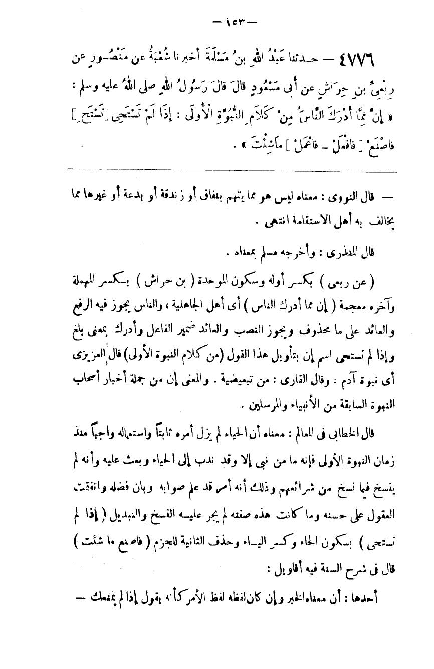 قَالَ الْخَطَّابِيُّ فِي الْمَعَالِم : مَعْنَاهُ أَنَّ الْحَيَاء لَمْ يَزَلْ أَمْره ثَابِتًا وَاسْتِعْمَاله وَاجِبًا مُنْذُ زَمَان النُّبُوَّة الْأُولَى فَإِنَّهُ مَا مِنْ نَبِيّ إِلَّا وَقَدْ نُدِبَ إِلَى الْحَيَاء وَبُعِثَ عَلَيْهِ وَأَنَّهُ لَمْ يُنْسَخ فِيمَا نُسِخَ مِنْ شَرَائِعهمْ وَذَلِكَ أَنَّهُ أَمْر قَدْ عُلِمَ صَوَابه وَبَانَ فَضْله وَاتَّفَقَتْ الْعُقُول عَلَى حُسْنه وَمَا كَانَتْ هَذِهِ صِفَته لَمْ يَجْرِ عَلَيْهِ النَّسْخ وَالتَّبْدِيل