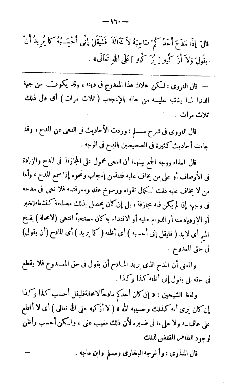 قَالَ النَّوَوِيّ فِي شَرْح مُسْلِم : وَرَدَتْ الْأَحَادِيث فِي النَّهْي عَنْ الْمَدْح ، وَقَدْ جَاءَتْ أَحَادِيث كَثِيرَة فِي الصَّحِيحَيْنِ بِالْمَدْحِ فِي الْوَجْه .