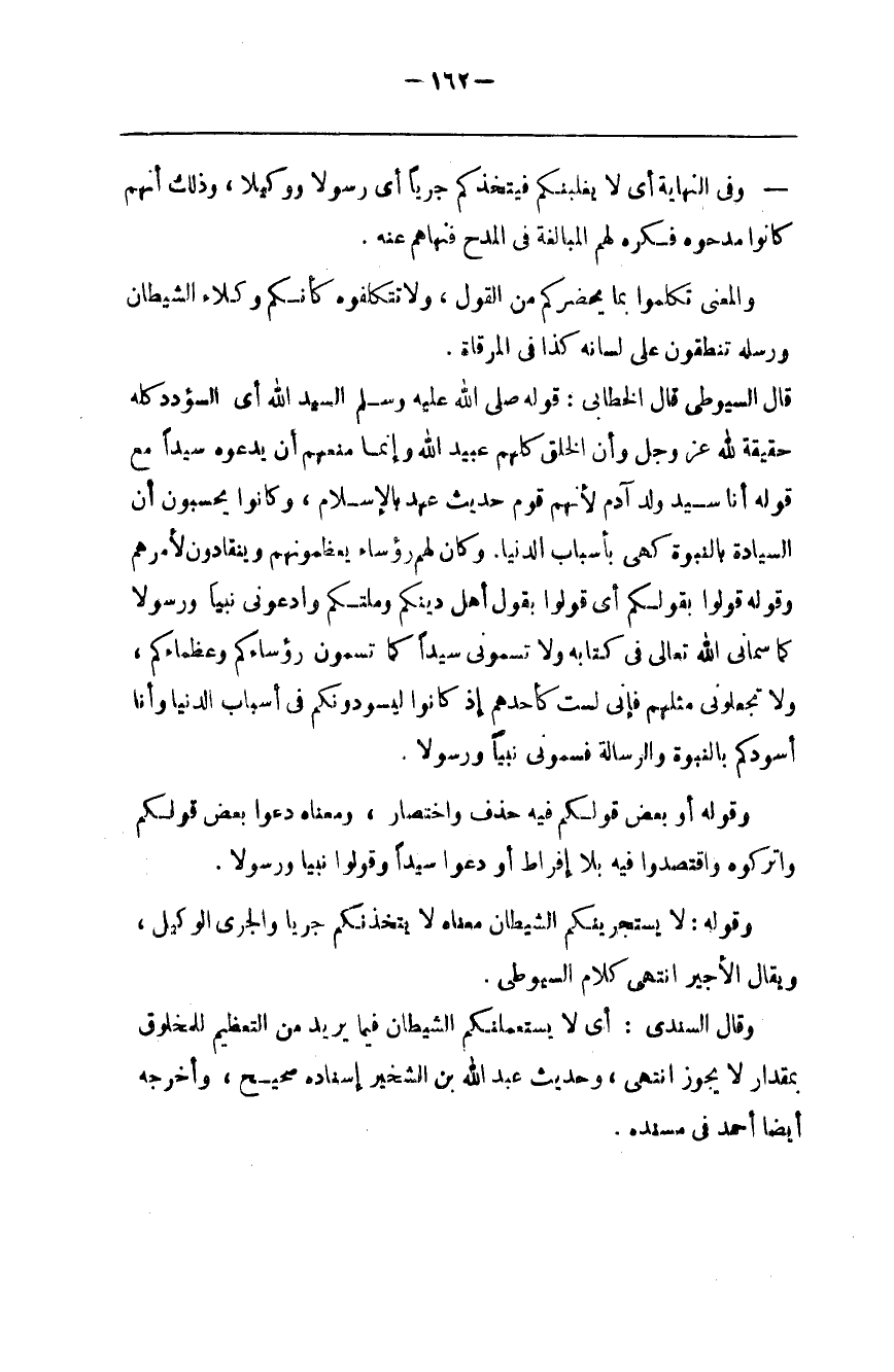 وَقَالَ السِّنْدِيُّ : أَيْ لَا يَسْتَعْمِلَنكُمْ الشَّيْطَان فِيمَا يُرِيد مِنْ التَّعْظِيم لِلْمَخْلُوقِ بِمِقْدَارِ لَا يَجُوز اِنْتَهَى ، وَحَدِيث عَبْد اللَّه بْن الشِّخِّير إِسْنَاده صَحِيح ، وَأَخْرَجَهُ أَيْضًا أَحْمَد فِي مُسْنَده .@