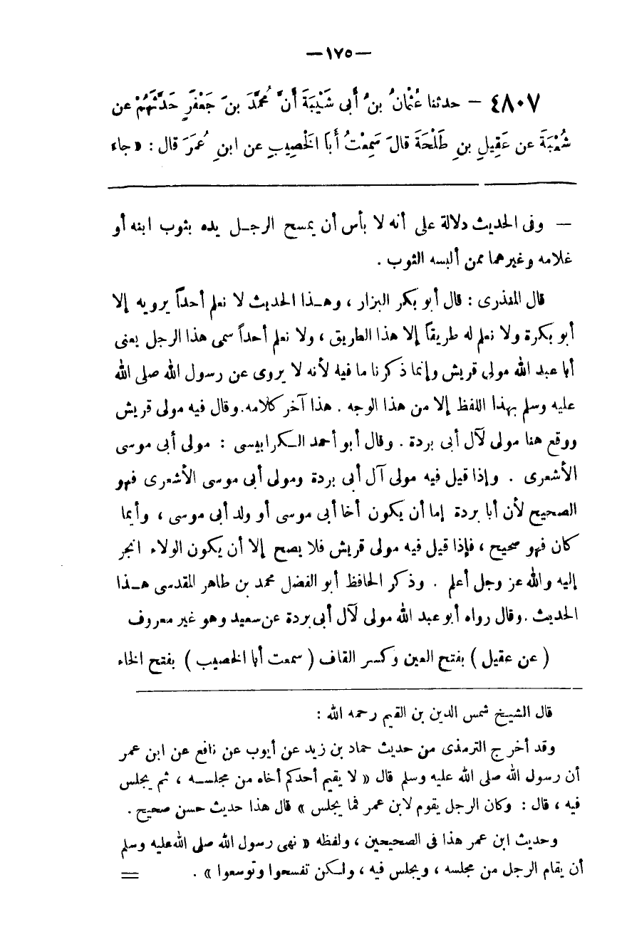 قال الشيخ شمس الدين ابن القيم رحمه الله وقد أخرج الترمذي من حديث حماد بن زيد عن أيوب عن نافع عن ابن عمر أن رسول الله صلى الله عليه و سلم قال لا يقيم أحدكم أخاه من مجلسه ثم يجلس فيه قال وكان الرجل يقوم لابن عمر فما يجلس قال هذا حديث حسن صحيح