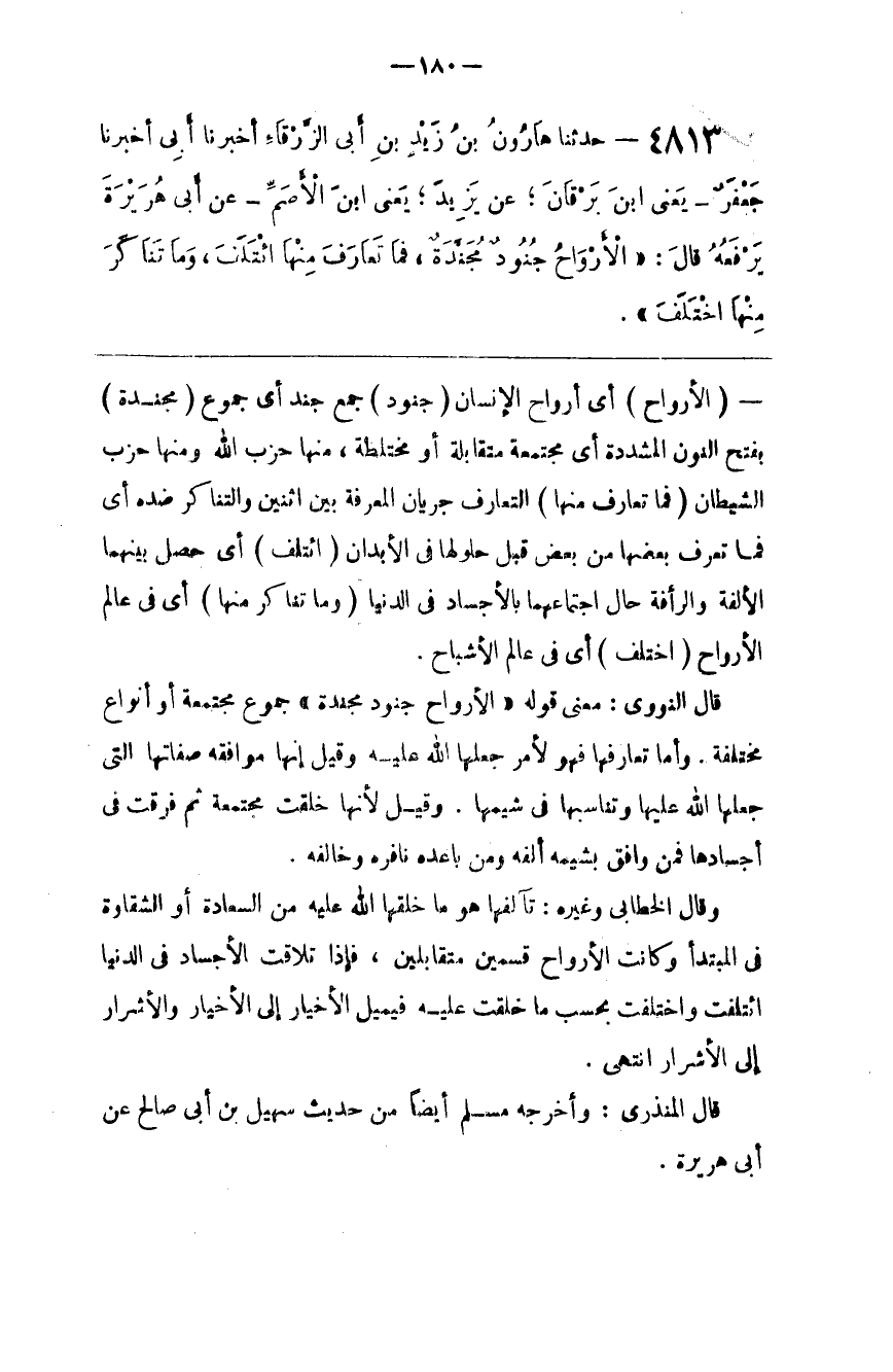 قَالَ النَّوَوِيّ : مَعْنَى قَوْله " الْأَرْوَاح جُنُود مُجَنَّدَة " جُمُوع مُجْتَمِعَة أَوْ أَنْوَاع مُخْتَلِفَة وَأَمَّا تَعَارُفهَا فَهُوَ لِأَمْرٍ جَعَلَهَا اللَّه عَلَيْهِ وَقِيلَ إِنَّهَا مُوَافِقَة صِفَاتهَا الَّتِي جَعَلَهَا اللَّه عَلَيْهَا وَتُنَاسِبهَا فِي شِيَمهَا . وَقِيلَ لِأَنَّهَا خُلِقَتْ مُجْتَمَعَة ثُمَّ فُرِّقَتْ فِي أَجْسَادهَا فَمَنْ وَافَقَ بِشِيَمِهِ أَلِفَهُ وَمَنْ بَاعَدَهُ نَافَرَهُ وَخَالَفَهُ .
