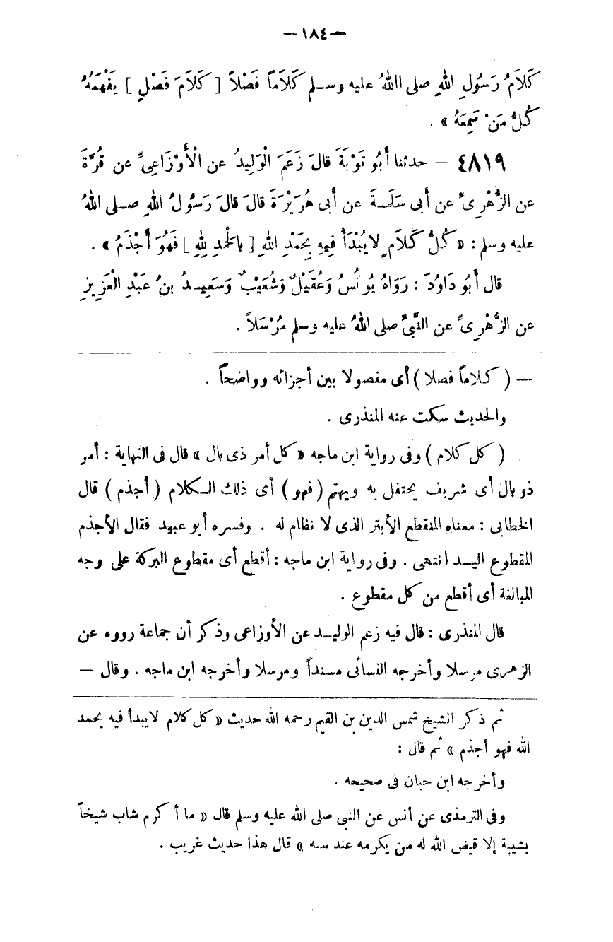 ثم ذكر الشيخ شمس الدين ابن القيم رحمه الله حديث كل كلام لا يبدأ فيه بحمد الله فهو أجذم ثم قال وأخرجه ابن حبان في صحيحه