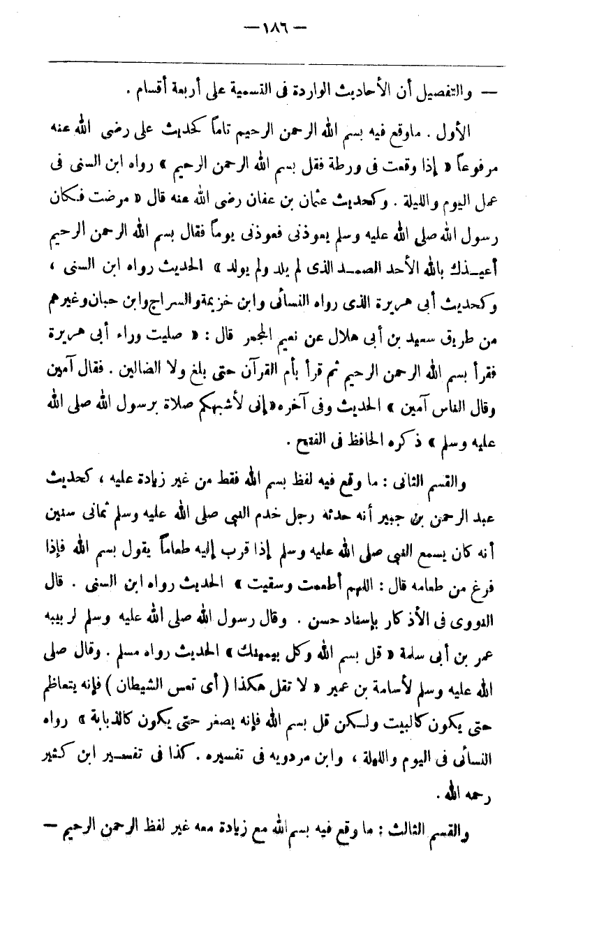 وَالْقِسْم الثَّانِي : مَا وَقَعَ فِيهِ لَفْظ بِسْمِ اللَّه فَقَطْ مِنْ غَيْر زِيَادَة عَلَيْهِ ، كَحَدِيثِ عَبْد الرَّحْمَن بْن جُبَيْر أَنَّهُ حَدَّثَهُ رَجُل خَدَمَ النَّبِيّ صَلَّى اللَّه عَلَيْهِ وَسَلَّمَ ثَمَانِي سِنِينَ أَنَّهُ كَانَ يَسْمَع النَّبِيّ صَلَّى اللَّه عَلَيْهِ وَسَلَّمَ إِذَا قَرَّبَ إِلَيْهِ طَعَامًا يَقُول بِسْمِ اللَّه فَإِذَا فَرَغَ مِنْ طَعَامه قَالَ " اللَّهُمَّ أَطْعَمْت وَسَقَيْت " الْحَدِيث رَوَاهُ اِبْن السُّنِّيّ . قَالَ النَّوَوِيّ فِي الْأَذْكَار بِإِسْنَادٍ حَسَن . وَقَالَ رَسُول اللَّه صَلَّى اللَّه عَلَيْهِ وَسَلَّمَ لِرَبِيبِهِ عُمَر بْن أَبِي سَلَمَة " قُلْ بِسْمِ اللَّه وَكُلْ بِيَمِينِك " الْحَدِيث رَوَاهُ مُسْلِم . وَقَالَ صَلَّى اللَّه عَلَيْهِ وَسَلَّمَ لِأُسَامَة بْن عُمَيْر " لَا تَقُلْ هَكَذَا ( أَيْ تَعِسَ الشَّيْطَان ) : فَإِنَّهُ يَتَعَاظَم حَتَّى يَكُون كَالْبَيْتِ وَلَكِنْ قُلْ بِسْمِ اللَّه فَإِنَّهُ يَصْغُر حَتَّى يَكُون كَالذُّبَابَةِ " رَوَاهُ النَّسَائِيُّ فِي الْيَوْم وَاللَّيْلَة ، وَابْن مَرْدَوَيْهِ فِي تَفْسِيره . كَذَا فِي تَفْسِير اِبْن كَثِير رَحِمَهُ اللَّه .