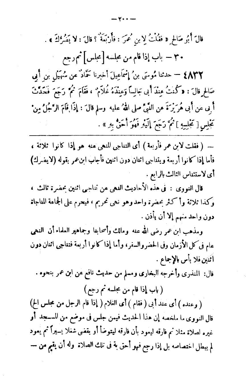 : أَيْ التَّنَاجِي الْمَنْهِيّ عَنْهُ هُوَ إِذَا كَانُوا ثَلَاثَة ، فَأَمَّا إِذَا كَانُوا أَرْبَعَة وَيَتَنَاجَى اِثْنَانِ دُون اِثْنَيْنِ فَأَجَابَ اِبْن عُمَر بِقَوْلِهِ
