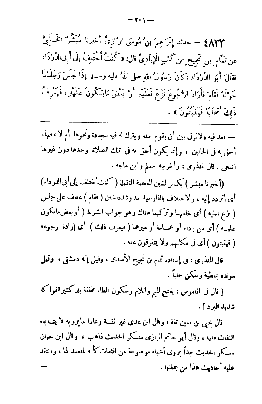 قَالَ الْمُنْذِرِيُّ : فِي إِسْنَاده تَمَام بْن نَجِيح الْأَسَدِيُّ ، وَقِيلَ إِنَّهُ دِمَشْقِيّ ، وَقِيلَ مَوْلِده بِمَلْطِيَةَ وَسَكَنَ حَلَبًا .
