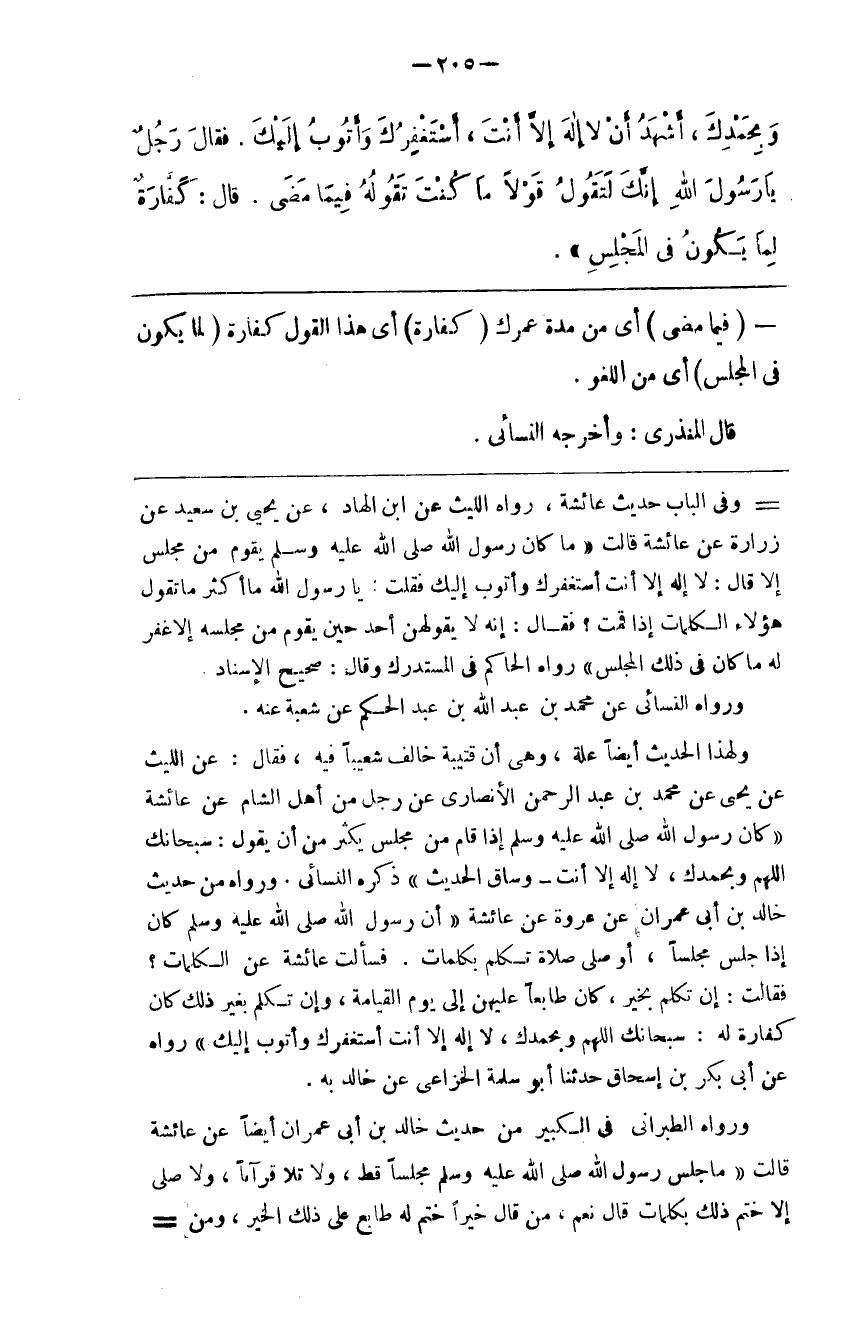 فسألت عائشة عن الكلمات فقالت إن تكلم بخير كان طابعا عليهن إلى يوم القيامة وإن تكلم بغير ذلك كان كفارة له سبحانك اللهم وبحمدك لا إله إلا أنت أستغفرك وأتوب إليك رواه عن أبي بكر بن إسحاق حدثنا أبو سلمة الخزاعي عن خالد به