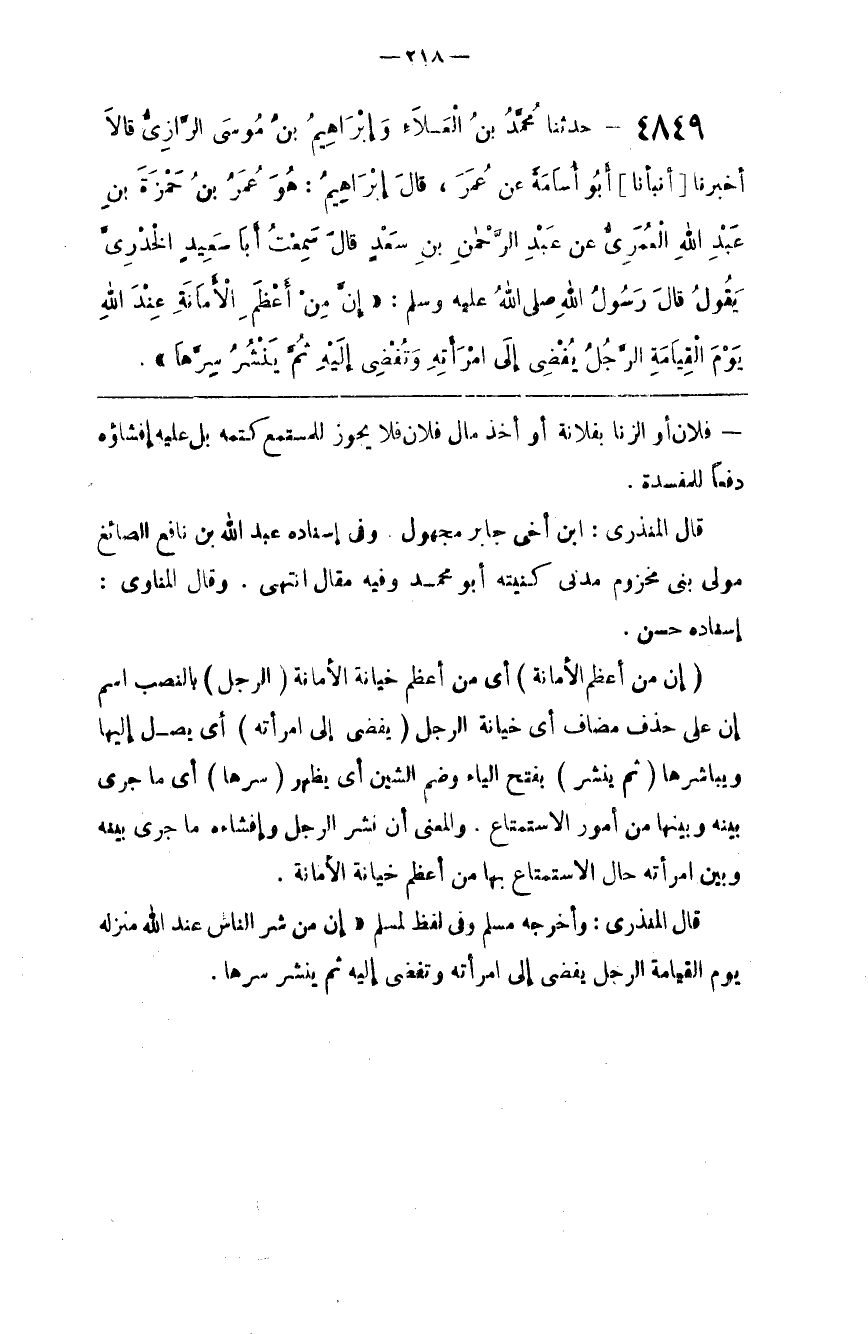 قَالَ الْمُنْذِرِيُّ : وَأَخْرَجَهُ مُسْلِم وَفِي لَفْظ لِمُسْلِمٍ " إِنَّ مِنْ شَرِّ النَّاس عِنْد اللَّه مَنْزِلَة يَوْم الْقِيَامَة الرَّجُل يُفْضِي إِلَى اِمْرَأَته وَتُفْضِي إِلَيْهِ ثُمَّ يَنْشُر سِرّهَا " .@