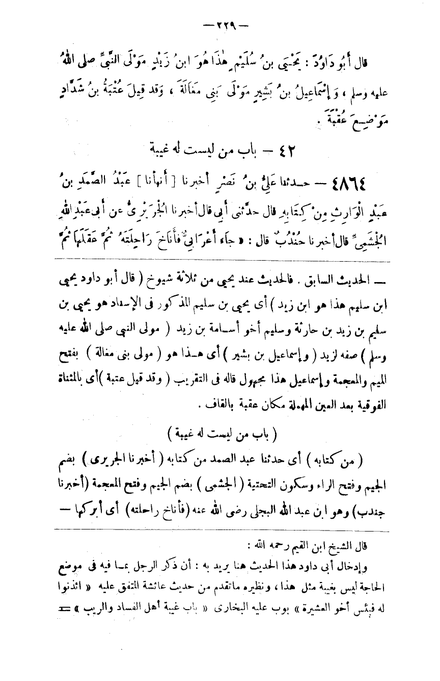 قال الشيخ سمش الدين القيم رحمه الله وإدخال أبي داود هذا الحديث هنا يريد به أن ذكر الرجل بما فيه في موضع الحاجة ليس بغيبة مثل هذا ونظيره ما تقدم من حديث عائشة المتفق عليه ائذنوا له فبئس أخو العشيرة بوب عليه البخاري