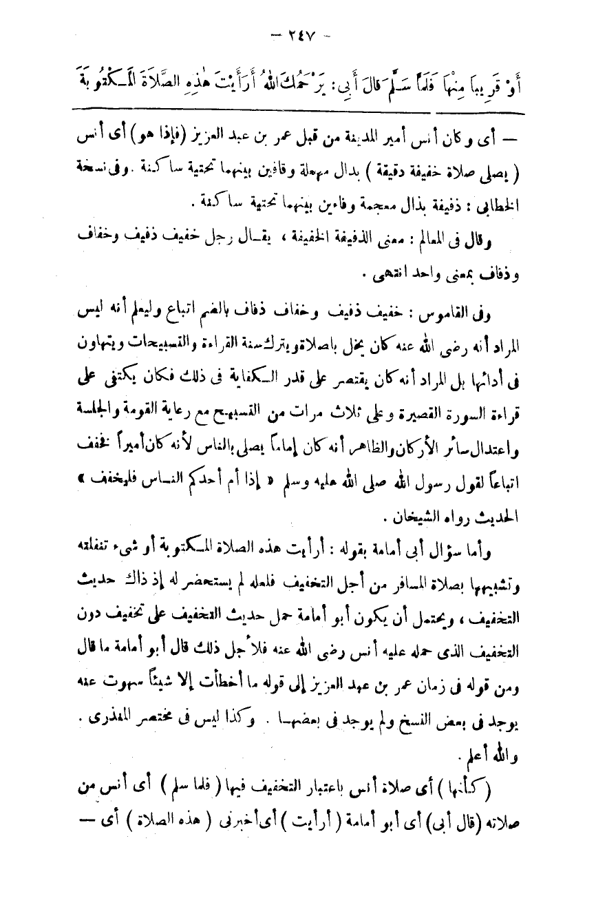 وَأَمَّا سُؤَال أَبِي أُمَامَةَ بِقَوْلِهِ : أَرَأَيْت هَذِهِ الصَّلَاة الْمَكْتُوبَة أَوْ شَيْء تَنَفَّلْته وَتَشْبِيههَا بِصَلَاةِ الْمُسَافِر مِنْ أَجْل التَّخْفِيف فَلَعَلَّهُ لَمْ يَسْتَحْضِر لَهُ إِذْ ذَاكَ حَدِيث التَّخْفِيف ، وَيَحْتَمِل أَنْ يَكُون أَبُو أُمَامَةَ حَمَلَ حَدِيث التَّخْفِيف عَلَى تَخْفِيف دُون التَّخْفِيف الَّذِي حَمَلَهُ عَلَيْهِ أَنَس رَضِيَ اللَّه عَنْهُ فَلِأَجْلِ ذَلِكَ قَالَ أَبُو أُمَامَةَ مَا قَالَ وَمِنْ قَوْله فِي زَمَان عُمَر بْن عَبْد الْعَزِيز إِلَى قَوْله مَا أَخْطَأْت إِلَّا شَيْئًا سَهَوْت عَنْهُ يُوجَد فِي بَعْض النُّسَخ وَلَمْ يُوجَد فِي بَعْضهَا . وَكَذَا لَيْسَ فِي مُخْتَصَر الْمُنْذِرِيِّ . وَاَللَّه أَعْلَم .