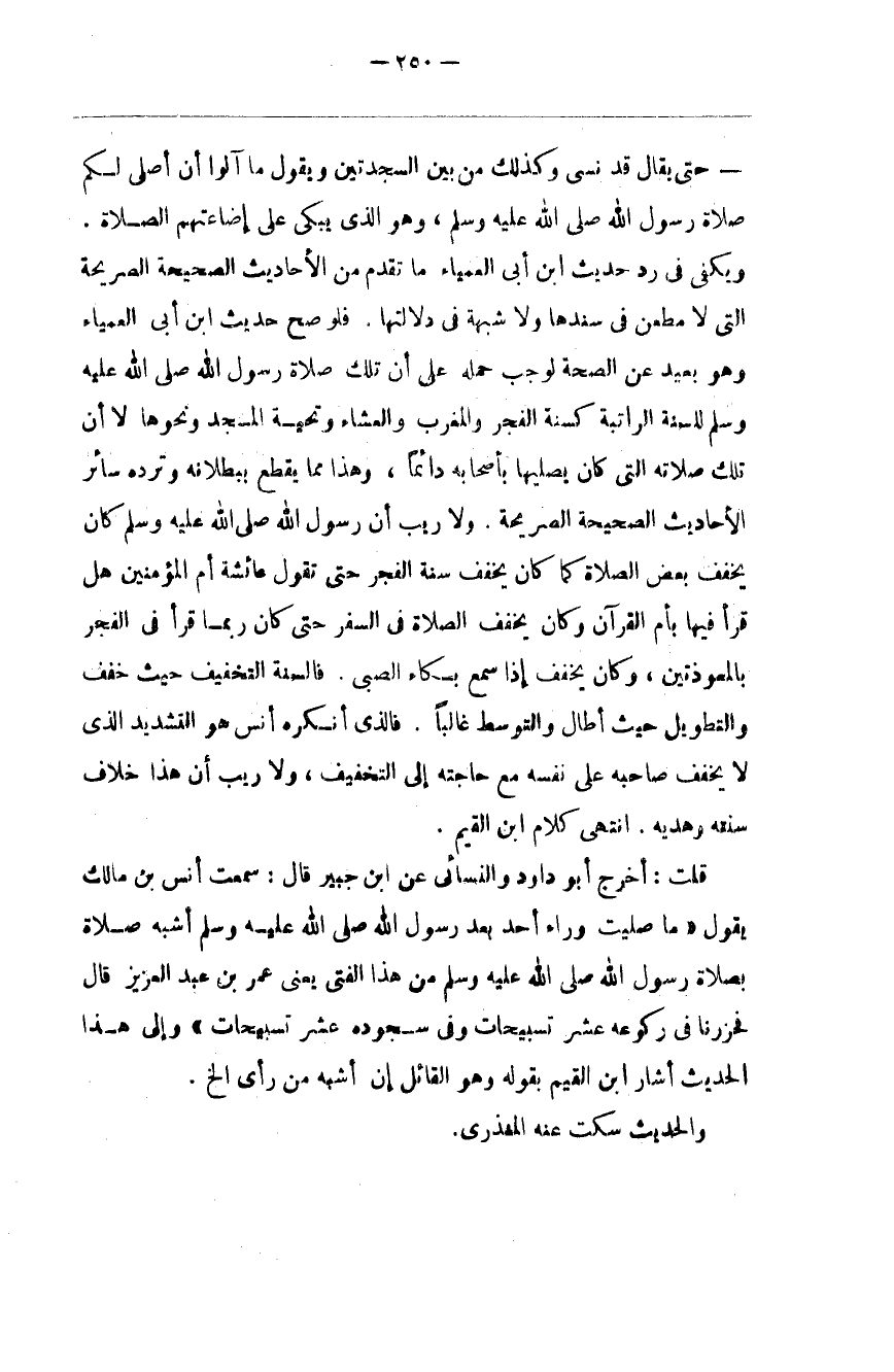 حَتَّى يُقَال قَدْ نَسِيَ وَكَذَلِكَ مِنْ بَيْن السَّجْدَتَيْنِ وَيَقُول مَا آلَوْا أَنْ أُصَلِّي لَكُمْ صَلَاة رَسُول اللَّه صَلَّى اللَّه عَلَيْهِ وَسَلَّمَ ، وَهُوَ الَّذِي يَبْكِي عَلَى إِضَاعَتهمْ الصَّلَاة . وَيَكْفِي فِي رَدِّ حَدِيث اِبْن أَبِي الْعَمْيَاء مَا تَقَدَّمَ مِنْ الْأَحَادِيث الصَّحِيحَة الصَّرِيحَة الَّتِي لَا مَطْعَن فِي سَنَدهَا وَلَا شُبْهَة فِي دَلَالَتهَا . فَلَوْ صَحَّ حَدِيث اِبْن أَبِي الْعَمْيَاء وَهُوَ بَعِيد عَنْ الصِّحَّة لَوَجَبَ حَمْله عَلَى أَنَّ تِلْكَ صَلَاة رَسُول اللَّه صَلَّى اللَّه عَلَيْهِ وَسَلَّمَ لِلسُّنَّةِ الرَّاتِبَة كَسُنَّةِ الْفَجْر وَالْمَغْرِب وَالْعِشَاء وَتَحِيَّة الْمَسْجِد وَنَحْوهَا لَا أَنَّ تِلْكَ صَلَاته الَّتِي كَانَ يُصَلِّيهَا بِأَصْحَابِهِ دَائِمًا ، وَهَذَا مِمَّا يُقْطَع بِبُطْلَانِهِ وَتَرُدّهُ سَائِر الْأَحَادِيث الصَّحِيحَة الصَّرِيحَة . وَلَا رَيْب أَنَّ رَسُول اللَّه صَلَّى اللَّه عَلَيْهِ وَسَلَّمَ كَانَ يُخَفِّف بَعْض الصَّلَاة كَمَا كَانَ يُخَفِّف سُنَّة الْفَجْر حَتَّى تَقُول عَائِشَة أُمّ الْمُؤْمِنِينَ هَلْ قَرَأَ فِيهَا بِأُمِّ الْقُرْآن وَكَانَ يُخَفِّف الصَّلَاة فِي السَّفَر حَتَّى كَانَ رُبَّمَا قَرَأَ فِي الْفَجْر بِالْمُعَوِّذَتَيْنِ ، وَكَانَ يُخَفِّف إِذَا سَمِعَ بُكَاء الصَّبِيّ . فَالسُّنَّة التَّخْفِيف حَيْثُ خَفَّفَ وَالتَّطْوِيل حَيْثُ أَطَالَ وَالتَّوَسُّط غَالِبًا . فَاَلَّذِي أَنْكَرَهُ أَنَس هُوَ التَّشْدِيد الَّذِي لَا يُخَفِّف صَاحِبه عَلَى نَفْسه مَعَ حَاجَته إِلَى التَّخْفِيف ، وَلَا رَيْب أَنَّ هَذَا خِلَاف سُنَّته وَهَدْيه . اِنْتَهَى كَلَام اِبْن الْقَيِّم .