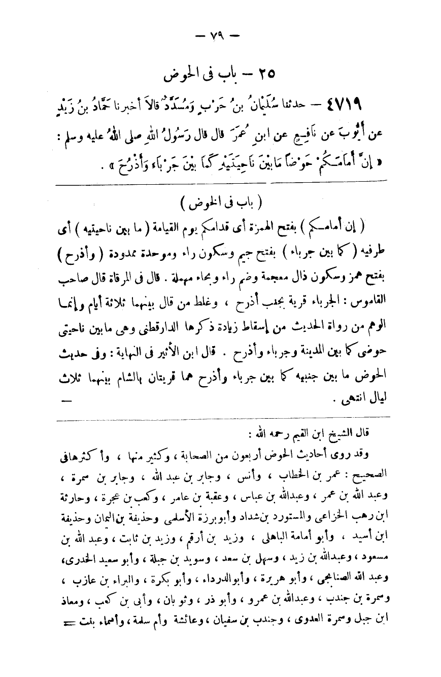 قال الشيخ ابن القيم رحمه الله وقد روى أحاديث الحوض أربعون من الصحابة وكثير منها وأكثرها في الصحيح عمر بن الخطاب وأنس وجابر بن عبد الله وجابر بن سمرة وعبد الله بن عمر وعبد الله بن عباس وعقبة بن عامر وكعب بن عجرة وحارثة ابن رهب الخزاعي والمستورد بن شداد وأبو برزة الأسلمي