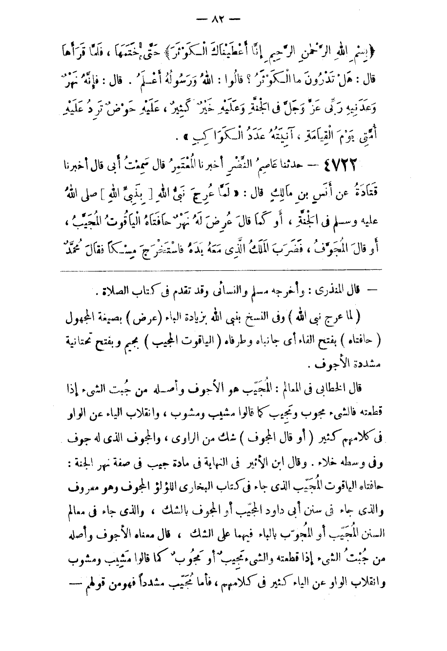 شَكٌّ مِنْ الرَّاوِي ، وَالْمُجَوَّف الَّذِي لَهُ جَوْف وَفِي وَسَطه خَلَاء. وَقَالَ اِبْن الْأَثِير فِي النِّهَايَة فِي مَادَّة جَيَبَ فِي صِفَة نَهْر الْجَنَّة : حَافَّتَاهُ الْيَاقُوت الْمُجَيَّب الَّذِي جَاءَ فِي كِتَاب الْبُخَارِيّ اللُّؤْلُؤ الْمُجَوَّف وَهُوَ مَعْرُوف وَاَلَّذِي جَاءَ فِي سُنَن أَبِي دَاوُدَ الْمُجَيَّب أَوْ الْمُجَوَّف بِالشَّكِّ ، وَاَلَّذِي جَاءَ فِي مَعَالِم السُّنَن الْمُجَيَّب أَوْ الْمُجَوَّب بِالْبَاءِ فِيهِمَا عَلَى الشَّكّ ، قَالَ مَعْنَاهُ الْأَجْوَف وَأَصْله مِنْ جُبْت الشَّيْء إِذَا قَطَعْته وَالشَّيْء مُجَيَّب أَوْ مُجَوَّب كَمَا قَالُوا مُشَيَّب وَمُشَوَّب وَانْقِلَاب الْوَاو عَنْ الْيَاء كَثِير فِي كَلَامهمْ ، فَأَمَّا مُجَيَّب مُشَدَّدًا فَهُوَ مِنْ قَوْلهمْ@
