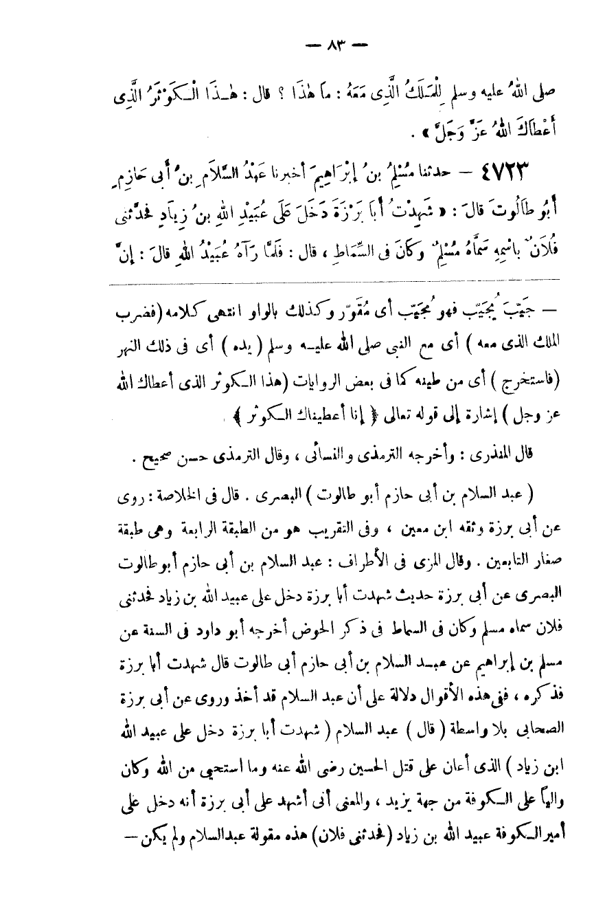 وَقَالَ الْمِزِّيّ فِي الْأَطْرَاف : عَبْد السَّلَام بْن أَبِي حَازِم أَبُو طَالُوت الْبَصْرِيّ عَنْ أَبِي بَرْزَة حَدِيث شَهِدْت أَبَا بَرْزَة دَخَلَ عَلَى عُبَيْد اللَّه بْن زِيَاد فَحَدَّثَنِي فُلَان سَمَّاهُ مُسْلِم وَكَانَ فِي السِّمَاط فِي ذِكْر الْحَوْض أَخْرَجَهُ أَبُو دَاوُدَ فِي السُّنَّة عَنْ مُسْلِم بْن إِبْرَاهِيم عَنْ عَبْد السَّلَام بْن أَبِي حَازِم أَبِي طَالُوت قَالَ شَهِدْت أَبَا بَرْزَة فَذَكَرَهُ ، فَفِي هَذِهِ الْأَقْوَال دَلَالَة عَلَى أَنَّ عَبْد السَّلَام قَدْ أَخَذَ وَرَوَى عَنْ أَبِي بَرْزَة الصَّحَابِيّ بِلَا وَاسِطَة