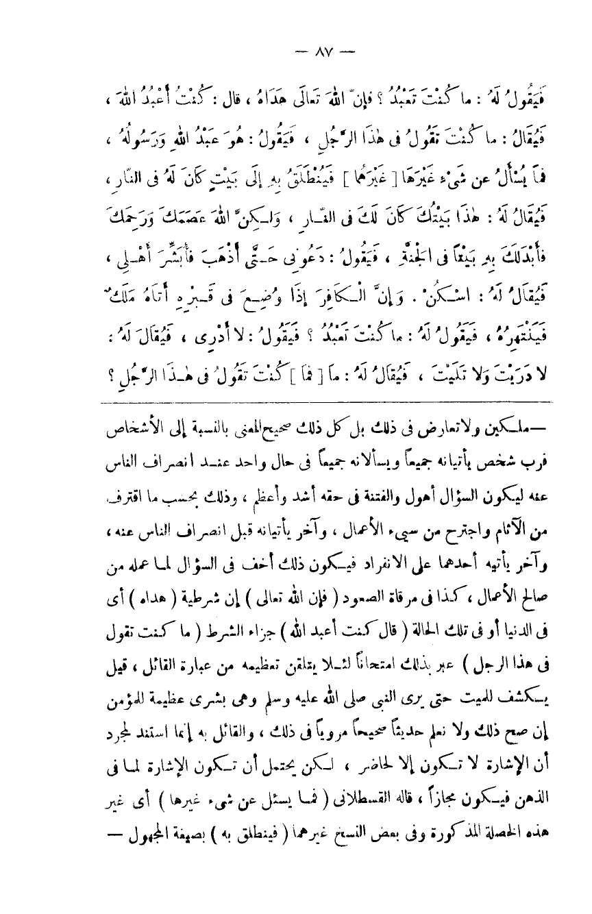 عَبَّرَ بِذَلِكَ اِمْتِحَانًا لِئَلَّا يَتَلَقَّن تَعْظِيمه مِنْ عِبَارَة الْقَائِل ، قِيلَ يُكْشَف لِلْمَيِّتِ حَتَّى يَرَى النَّبِيّ صَلَّى اللَّه عَلَيْهِ وَسَلَّمَ وَهِيَ بُشْرَى عَظِيمَة لِلْمُؤْمِنِ إِنْ صَحَّ ذَلِكَ وَلَا نَعْلَم حَدِيثًا صَحِيحًا مَرْوِيًّا فِي ذَلِكَ ، وَالْقَائِل بِهِ إِنَّمَا اِسْتَنَدَ لِمُجَرَّدِ أَنَّ الْإِشَارَة لَا تَكُون إِلَّا لِحَاضِرٍ ، لَكِنْ يَحْتَمِل أَنْ تَكُون الْإِشَارَة لِمَا فِي الذِّهْن فَيَكُون مَجَازًا ، قَالَهُ الْقَسْطَلَّانِيُّ