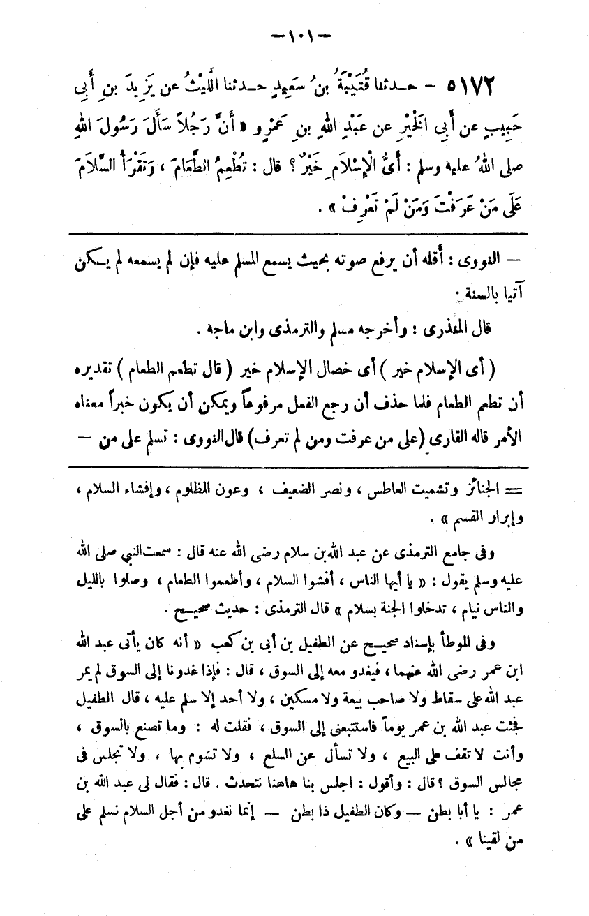وفي جامع الترمذي عن عبد الله بن سلام رضي الله عنه قال سمعت النبي صلى الله عليه و سلم يقول يا أيها الناس أفشوا السلام وأطعموا الطعام وصلوا بالليل والناس نيام تدخلوا الجنة بسلام قال الترمذي حديث صحيح