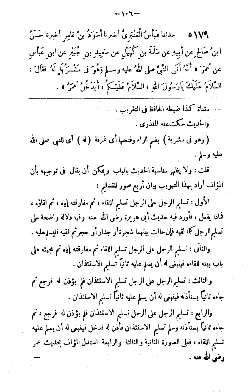 وَالرَّابِع : تَسْلِيم الرَّجُل عَلَى الرَّجُل تَسْلِيم الِاسْتِئْذَان فَلَمْ يُؤْذَن لَهُ فَرَجَعَ ، ثُمَّ جَاءَهُ ثَانِيًا يَسْتَأْذِنهُ وَسَلَّمَ تَسْلِيم الِاسْتِئْذَان فَأَذِنَ لَهُ فَدَخَلَ فَيَنْبَغِي لَهُ أَنْ يُسَلِّم عَلَيْهِ تَسْلِيمَ اللِّقَاء ، فَعَلَى الصُّورَة الثَّانِيَة وَالثَّالِثَة وَالرَّابِعَة اِسْتَدَلَّ الْمُؤَلِّف بِحَدِيثِ عُمَر رَضِيَ اللَّهُ عَنْهُ .@