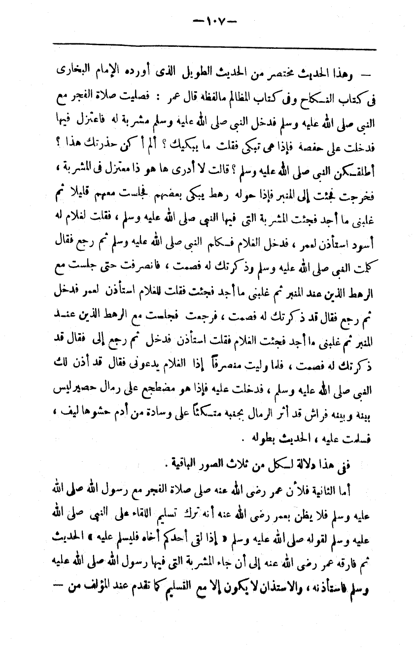 هَذَا الْحَدِيث مُخْتَصَرٌ مِنْ الْحَدِيث الطَّوِيل الَّذِي أَوْرَدَهُ الْإِمَام الْبُخَارِيّ فِي كِتَاب النِّكَاح وَفِي كِتَاب الْمَظَالِم مَا لَفْظه قَالَ عُمَر : فَصَلَّيْت صَلَاة الْفَجْر مَعَ النَّبِيّ صَلَّى اللَّه عَلَيْهِ وَسَلَّمَ فَدَخَلَ النَّبِيّ صَلَّى اللَّه عَلَيْهِ وَسَلَّمَ مَشْرُبَةً لَهُ فَاعْتَزَلَ فِيهَا فَدَخَلْت عَلَى حَفْصَة فَإِذَا هِيَ تَبْكِي فَقُلْت مَا يُبْكِيك ؟ أَلَمْ أَكُنْ حَذَّرْتُك هَذَا ؟ أَطَلَّقَكُنَّ النَّبِيّ صَلَّى اللَّه عَلَيْهِ وَسَلَّمَ ؟ قَالَتْ لَا أَدْرِي هَا هُوَ ذَا مُعْتَزِلٌ فِي الْمَشْرُبَةِ ، فَخَرَجْت فَجِئْت إِلَى الْمِنْبَر فَإِذَا حَوْله رَهْط يَبْكِي بَعْضهمْ فَجَلَسْت مَعَهُمْ قَلِيلًا ثُمَّ غَلَبَنِي مَا أَجِد فَجِئْت الْمَشْرُبَة الَّتِي فِيهَا النَّبِيّ صَلَّى اللَّه عَلَيْهِ وَسَلَّمَ ، فَقُلْت لِغُلَامٍ لَهُ أَسْوَد اِسْتَأْذِنْ لِعُمَرَ ، فَدَخَلَ الْغُلَام فَكَلَّمَ النَّبِيّ صَلَّى اللَّه عَلَيْهِ وَسَلَّمَ ثُمَّ رَجَعَ فَقَالَ كَلَّمْت النَّبِيّ صَلَّى اللَّه عَلَيْهِ وَسَلَّمَ وَذَكَرْتُك لَهُ فَصَمَتَ ، فَانْصَرَفْت حَتَّى جَلَسْت مَعَ الرَّهْط الَّذِينَ عِنْدَ الْمِنْبَر ثُمَّ غَلَبَنِي مَا أَجِد فَجِئْت فَقُلْت لِلْغُلَامِ اِسْتَأْذِنْ لِعُمَرَ فَدَخَلَ ثُمَّ رَجَعَ فَقَالَ قَدْ ذَكَرْتُك لَهُ فَصَمَتَ ، فَرَجَعْت فَجَلَسْت مَعَ الرَّهْط الَّذِينَ عِنْد الْمِنْبَرِ ثُمَّ غَلَبَنِي مَا أَجِد فَجِئْت الْغُلَام فَقُلْت اِسْتَأْذِنْ فَدَخَلَ ثُمَّ رَجَعَ إِلَيَّ فَقَالَ قَدْ ذَكَرْتُك لَهُ فَصَمَتَ ، فَلَمَّا وَلَّيْت مُنْصَرِفًا إِذَا الْغُلَامُ يَدْعُونِي فَقَالَ قَدْ أَذِنَ لَك النَّبِيُّ صَلَّى اللَّهُ عَلَيْهِ وَسَلَّمَ ، فَدَخَلْت عَلَيْهِ فَإِذَا هُوَ مُضْطَجِعٌ عَلَى رِمَالِ حَصِيرٍ لَيْسَ بَيْنَهُ وَبَيْنَهُ فِرَاشٌ قَدْ أَثَّرَ الرِّمَالُ بِجَنْبِهِ مُتَّكِئًا عَلَى وِسَادَة مِنْ أَدَمٍ حَشْوُهَا لِيفٌ ، فَسَلَّمْت عَلَيْهِ ، الْحَدِيث بِطُولِهِ .