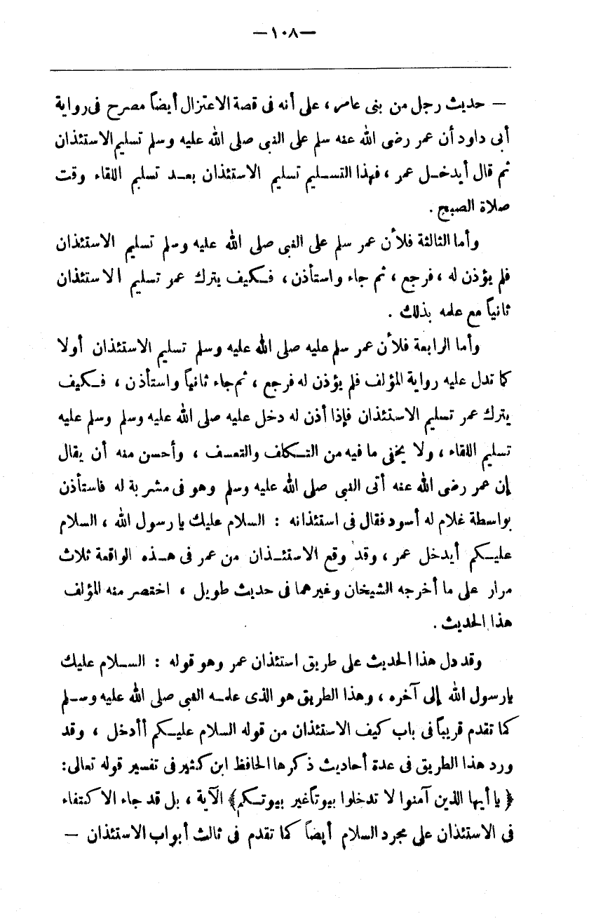حَدِيث رَجُل مِنْ بَنِي عَامِر ، عَلَى أَنَّهُ فِي قِصَّة الِاعْتِزَال أَيْضًا مُصَرَّح فِي رِوَايَة أَبِي دَاوُدَ أَنَّ عُمَر رَضِيَ اللَّه عَنْهُ سَلَّمَ عَلَى النَّبِيّ صَلَّى اللَّه عَلَيْهِ وَسَلَّمَ تَسْلِيم الِاسْتِئْذَان ثُمَّ قَالَ أَيَدْخُلُ عُمَر ، فَهَذَا التَّسْلِيم تَسْلِيم الِاسْتِئْذَان بَعْد تَسْلِيم اللِّقَاء وَقْت صَلَاة الصُّبْح .