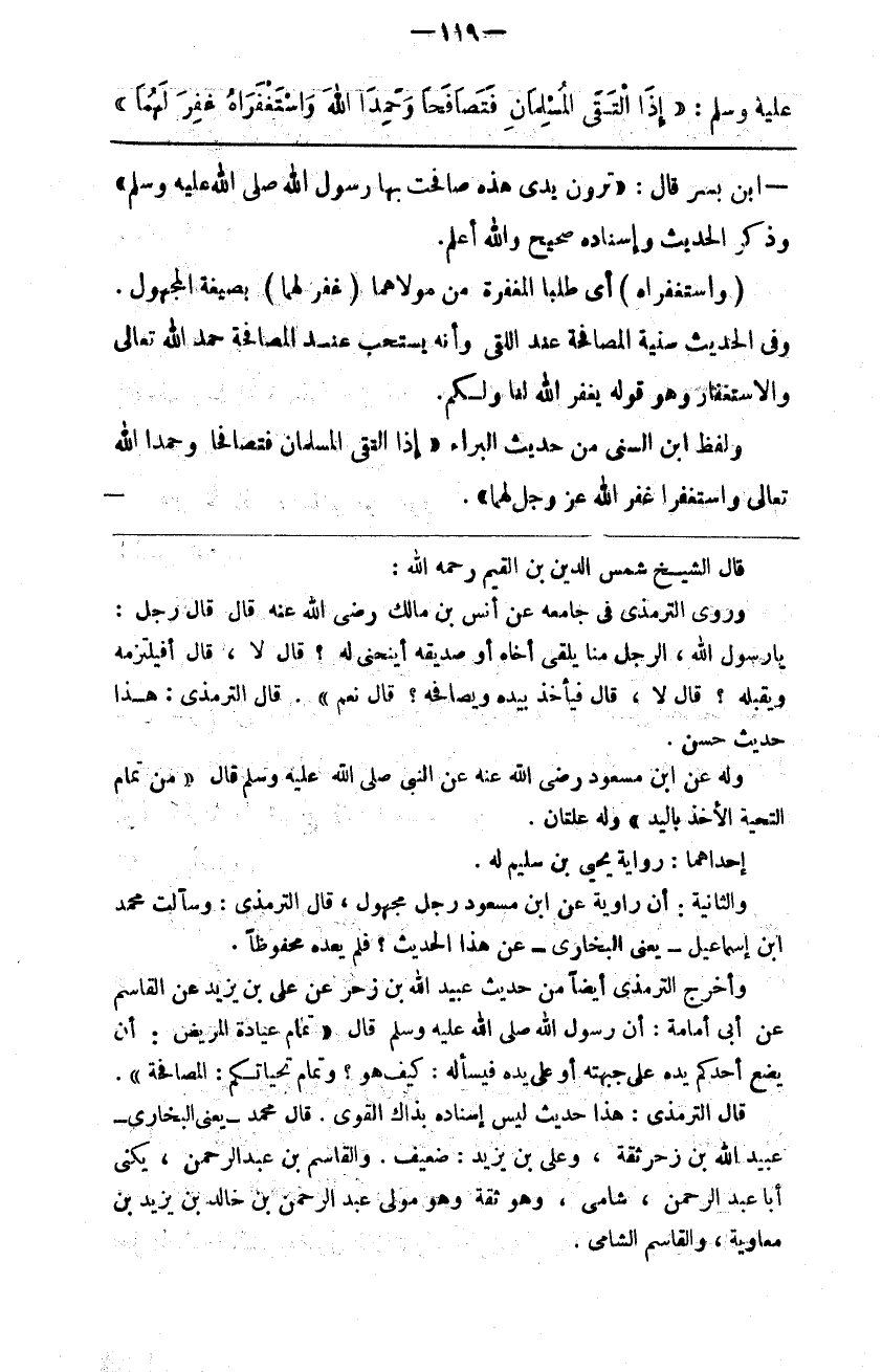 قال الشيخ شمس الدين ابن القيم رحمه الله وروى الترمذي في جامعه عن أنس بن مالك رضي الله عنه قال قال رجل يا رسول الله الرجل يلقى أخاه أو صديقه أينحني له قال لا قال أفيلتزمه ويقبله قال لا قال فيأخذ بيده ويصافحه قال نعم