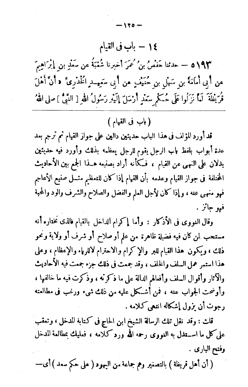 وَقَالَ النَّوَوِيّ فِي الْأَذْكَار : وَأَمَّا إِكْرَامُ الدَّاخِلِ بِالْقِيَامِ فَاَلَّذِي نَخْتَارهُ أَنَّهُ مُسْتَحَبٌّ لِمَنْ كَانَ فِيهِ فَضِيلَةٌ ظَاهِرَةٌ مِنْ عِلْمٍ أَوْ صَلَاحٍ أَوْ شَرَفٍ أَوْ وِلَايَةٍ وَنَحْوِ ذَلِكَ ، وَيَكُون هَذَا الْقِيَام لِلْبِرِّ وَالْإِكْرَام وَالِاحْتِرَام لَا لِلرِّيَاءِ وَالْإِعْظَام ، وَعَلَى هَذَا اِسْتَمَرَّ عَمَلُ السَّلَفِ وَالْخَلَفِ ، وَقَدْ جَمَعْت فِي ذَلِكَ جُزْءًا جَمَعْت فِيهِ الْأَحَادِيثَ وَالْآثَارَ وَأَقْوَالَ السَّلَفِ وَأَفْعَالَهُمْ الدَّالَّةَ عَلَى مَا ذَكَرْته ، وَذَكَرْت فِيهِ مَا خَالَفَهَا ، وَأَوْضَحْت الْجَوَاب عَنْهُ ، فَمَنْ أَشْكَلَ عَلَيْهِ مِنْ ذَلِكَ شَيْء وَرَغِبَ فِي مُطَالَعَتِهِ رَجَوْت أَنْ يَزُول إِشْكَالُهُ اِنْتَهَى كَلَامه .
