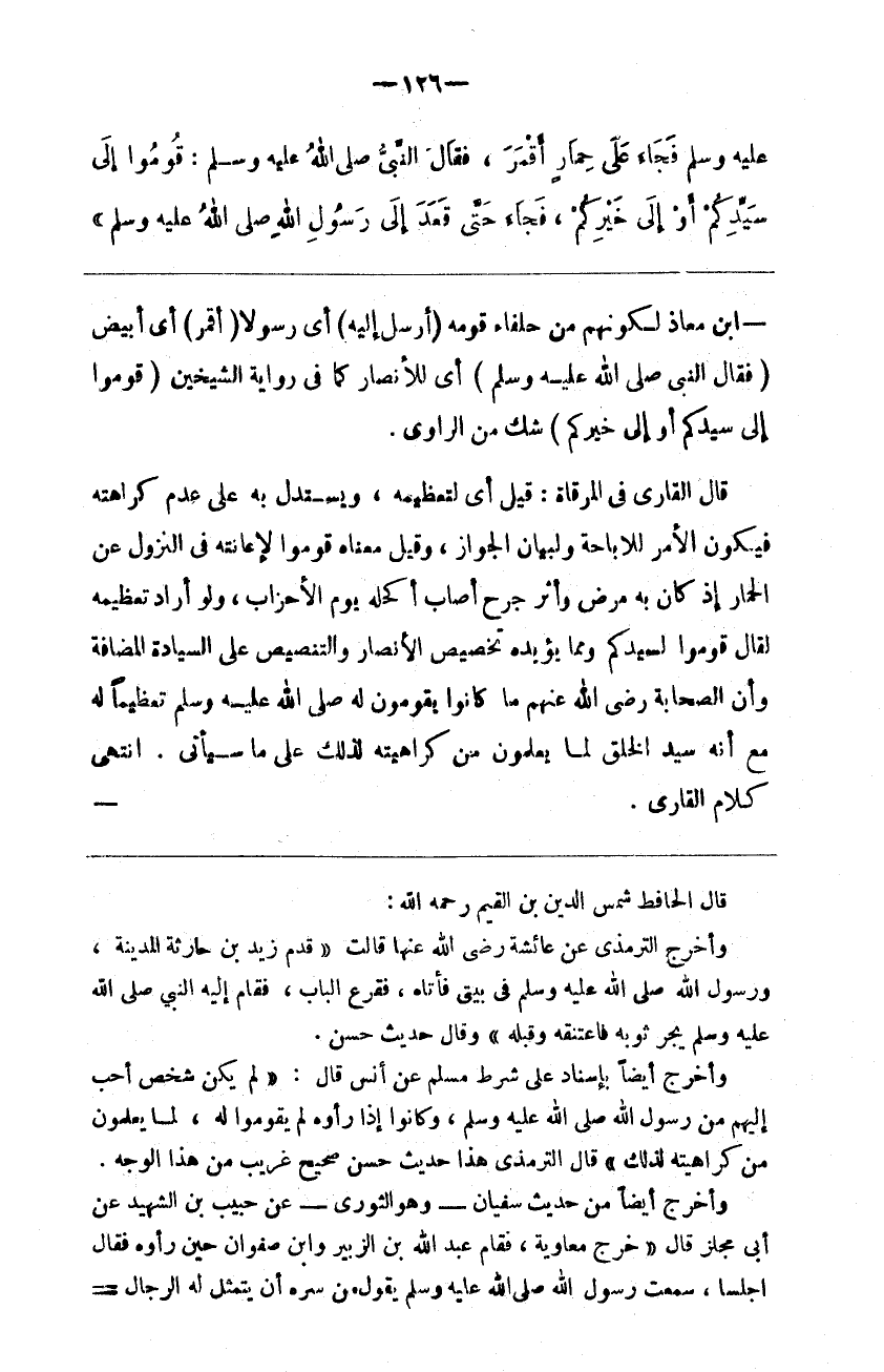 قال الحافظ الشيخ شمس الدين ابن القيم رحمه الله وأخرج الترمذي عن عائشة رضي الله عنها قالت قدم زيد بن حارثة المدينة ورسول الله صلى الله عليه و سلم في بيتي فأتاه فقرع الباب فقام إليه النبي صلى الله عليه و سلم يجر ثوبه فاعتنقه وقبله وقال حديث حسن