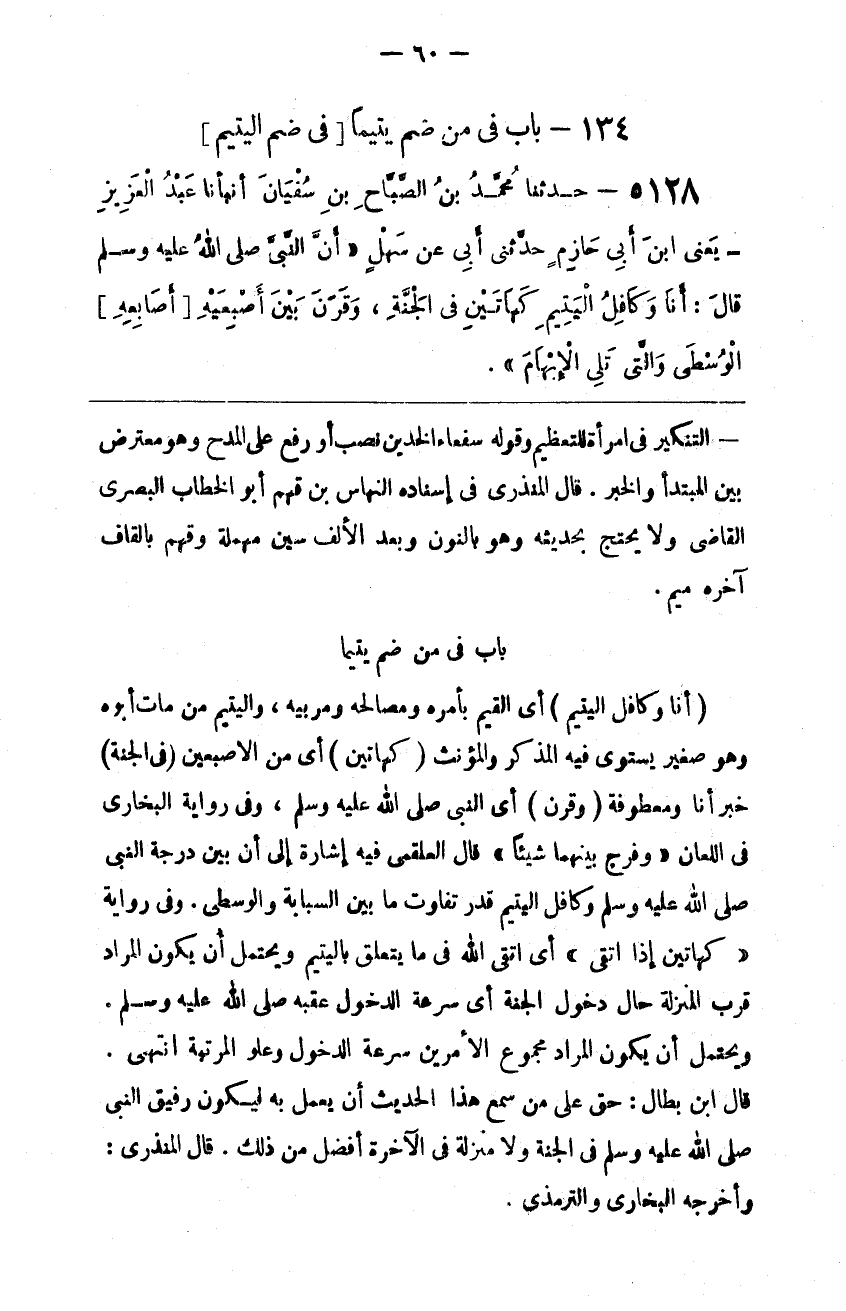 : أَيْ النَّبِيّ صَلَّى اللَّه عَلَيْهِ وَسَلَّمَ ، وَفِي رِوَايَة الْبُخَارِيّ فِي اللِّعَان " وَفَرَجَ بَيْنهمَا شَيْئًا " قَالَ الْعَلْقَمِيّ فِيهِ إِشَارَة إِلَى أَنَّ بَيْن دَرَجَة النَّبِيّ صَلَّى اللَّه عَلَيْهِ وَسَلَّمَ ، وَكَافِل الْيَتِيم قَدْر تَفَاوُت مَا بَيْن السَّبَّابَة وَالْوُسْطَى . وَفِي رِوَايَة " كَهَاتَيْنِ إِذَا اِتَّقَى " أَيْ اِتَّقَى اللَّه فِي مَا يَتَعَلَّق بِالْيَتِيمِ وَيَحْتَمِل أَنْ يَكُون الْمُرَاد قُرْب الْمَنْزِلَة حَال دُخُول الْجَنَّة أَيْ سُرْعَة الدُّخُول عَقِبه صَلَّى اللَّه عَلَيْهِ وَسَلَّمَ . وَيَحْتَمِل أَنْ يَكُون الْمُرَاد مَجْمُوع الْأَمْرَيْنِ سُرْعَة الدُّخُول وَعُلُوّ الْمَرْتَبَة اِنْتَهَى . قَالَ اِبْن بَطَّال : حَقٌّ عَلَى مَنْ سَمِعَ هَذَا الْحَدِيث أَنْ يَعْمَل بِهِ لِيَكُونَ رَفِيق النَّبِيّ صَلَّى اللَّه عَلَيْهِ وَسَلَّمَ فِي الْجَنَّة وَلَا مَنْزِلَة فِي الْآخِرَة أَفْضَل مِنْ ذَلِكَ . قَالَ الْمُنْذِرِيُّ : وَأَخْرَجَهُ الْبُخَارِيّ وَالتِّرْمِذِيّ .@