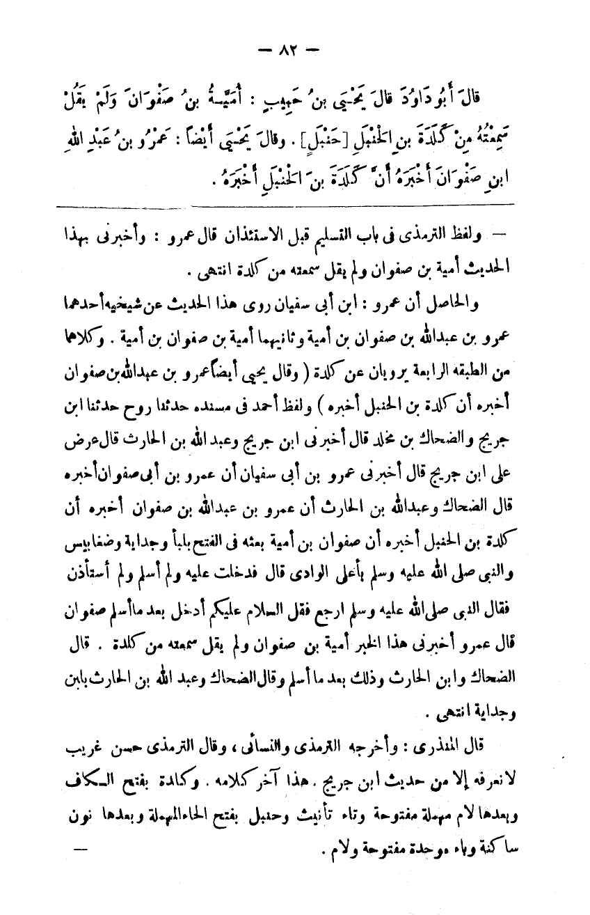 وَلَفْظ التِّرْمِذِيّ فِي بَاب التَّسْلِيم قَبْل الِاسْتِئْذَان قَالَ عَمْرو : وَأَخْبَرَنِي بِهَذَا الْحَدِيث أُمَيَّة مِنْ صَفْوَان وَلَمْ يَقُلْ سَمِعْته مِنْ كَلَدَة اِنْتَهَى .