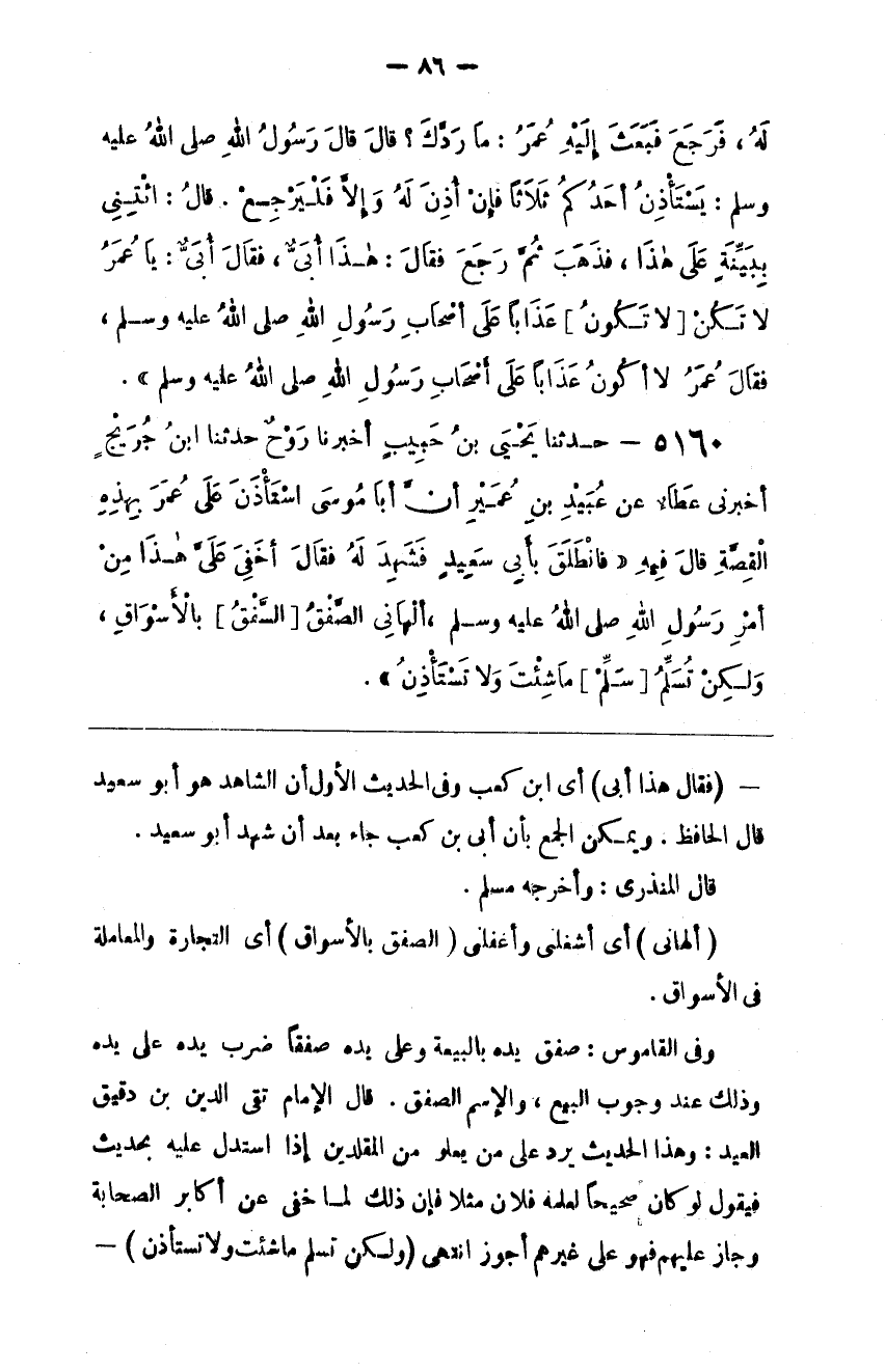 وَفِي الْقَامُوس : صَفَقَ يَده بِالْبَيْعَةِ وَعَلَى يَده صَفْقًا ضَرَبَ يَده عَلَى يَده وَذَلِكَ عِنْد وُجُوب الْبَيْع ، وَالِاسْم الصَّفْق . قَالَ الْإِمَام تَقِيّ الدِّين بْن دَقِيق الْعِيد : وَهَذَا الْحَدِيث يَرُدّ عَلَى مَنْ يَغْلُو مِنْ الْمُقَلِّدِينَ إِذَا اِسْتَدَلَّ عَلَيْهِ بِحَدِيثِ فَيَقُول لَوْ كَانَ صَحِيحًا لَعَلِمَهُ فُلَان مَثَلًا فَإِنَّ ذَلِكَ لَمَّا خَفِيَ عَنْ أَكَابِر الصَّحَابَة وَجَازَ عَلَيْهِمْ فَهُوَ عَلَى غَيْرهمْ أَجْوَزُ اِنْتَهَى