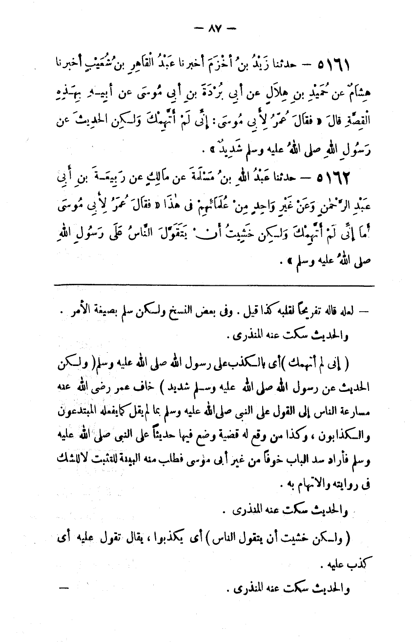 : خَافَ عُمَر رَضِيَ اللَّه عَنْهُ مُسَارَعَة النَّاس إِلَى الْقَوْل عَلَى النَّبِيّ صَلَّى اللَّه عَلَيْهِ وَسَلَّمَ بِمَا لَمْ يَقُلْ كَمَا يَفْعَلهُ الْمُبْتَدِعُونَ وَالْكَذَّابُونَ ، وَكَذَا مَنْ وَقَعَ لَهُ قَضِيَّة وَضَعَ فِيهَا حَدِيثًا عَلَى النَّبِيّ صَلَّى اللَّه عَلَيْهِ وَسَلَّمَ فَأَرَادَ سَدَّ الْبَاب خَوْفًا مِنْ غَيْر أَبِي مُوسَى فَطَلَبَ مِنْهُ الْبَيِّنَة لِلتَّثَبُّتِ لَا لِلشَّكِّ فِي رِوَايَته وَالِاتِّهَام بِهِ .