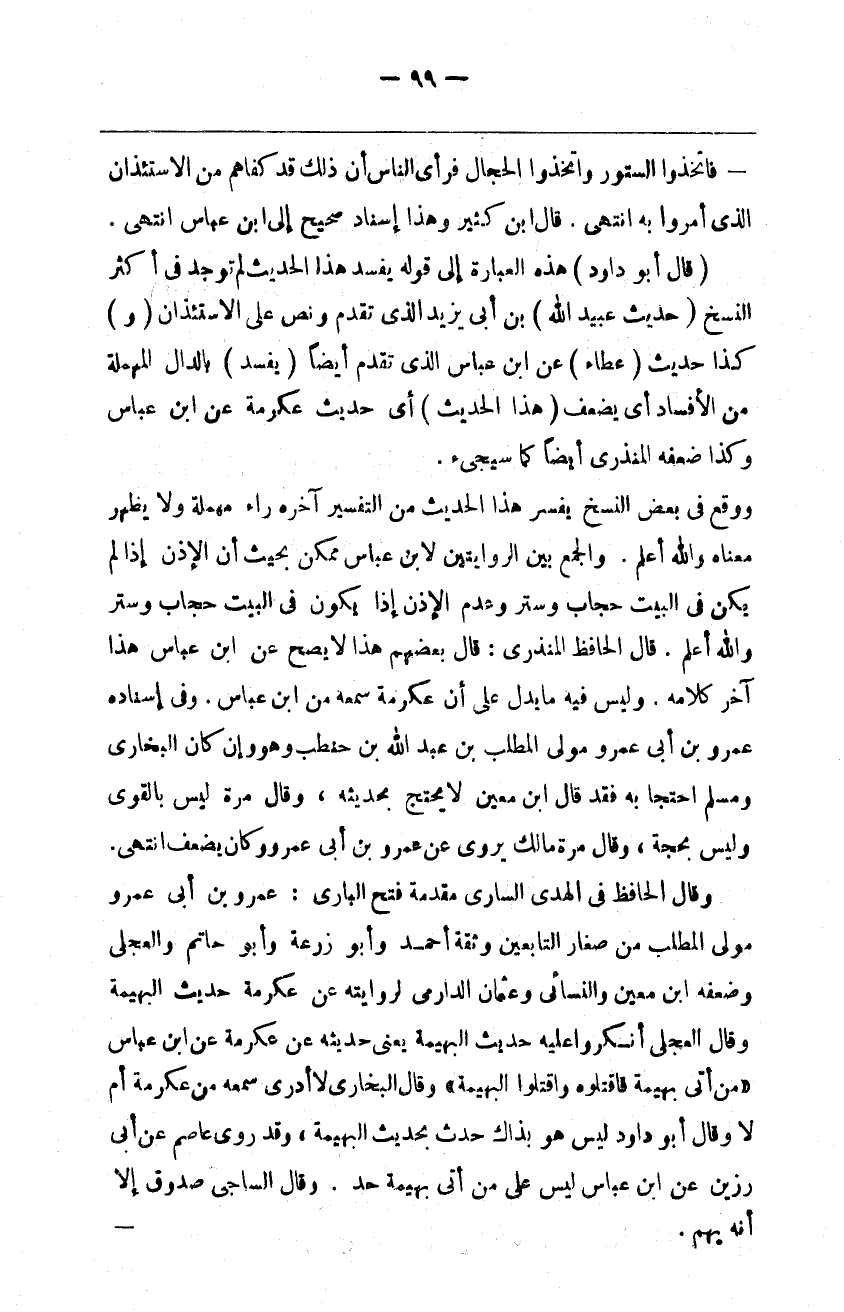 وَوَقَعَ فِي بَعْض النُّسَخ يُفَسِّر هَذَا الْحَدِيث مِنْ التَّفْسِير آخِرَهُ رَاءٌ مُهْمَلَةٌ وَلَا يَظْهَرُ مَعْنَاهُ وَاَللَّهُ أَعْلَمُ . وَالْجَمْع بَيْن الرِّوَايَتَيْنِ لِابْنِ عَبَّاس مُمْكِن بِحَيْثُ إِنَّ الْإِذْنَ إِذَا لَمْ يَكُنْ فِي الْبَيْت حِجَاب وَسِتْر وَعَدَم الْإِذْن إِذَا يَكُون فِي الْبَيْت حِجَابٌ وَسِتْرٌ وَاَللَّهُ أَعْلَمُ . قَالَ الْحَافِظ الْمُنْذِرِيُّ : قَالَ بَعْضهمْ هَذَا لَا يَصِحّ عَنْ اِبْن عَبَّاس هَذَا آخِر كَلَامه . وَلَيْسَ فِيهِ مَا يَدُلُّ عَلَى أَنَّ عِكْرِمَة سَمِعَهُ مِنْ اِبْن عَبَّاس . وَفِي إِسْنَادِهِ عَمْرُو بْنُ أَبِي عَمْرٍو مَوْلَى الْمُطَّلِب بْن عَبْد اللَّه اِبْن حَنْطَبَ وَهُوَ وَإِنْ كَانَ الْبُخَارِيُّ وَمُسْلِمٌ اِحْتَجَّا بِهِ فَقَدْ قَالَ اِبْن مَعِينٍ لَا يُحْتَجُّ بِحَدِيثِهِ ، وَقَالَ مَرَّةً لَيْسَ بِالْقَوِيِّ وَلَيْسَ بِحُجَّةٍ ، وَقَالَ مَرَّةً مَالِك يَرْوِي عَنْ عَمْرو بْن أَبِي عَمْرو وَكَانَ يُضَعَّف رَضِيَ اللَّه عَنْهُ اِنْتَهَى .